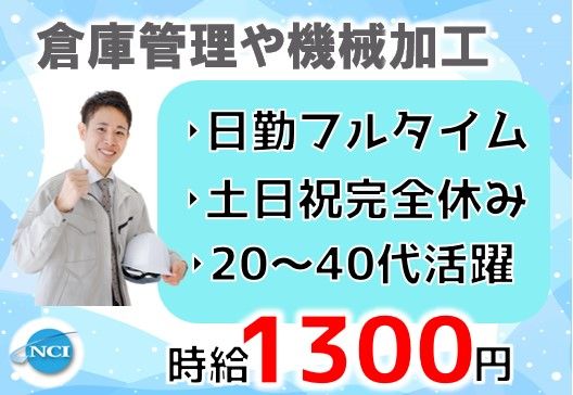 仕事内容 ■■■倉庫管理・機械加工■■■ ◎高時給で稼げる!! 時給1,300円のお仕事です!! 倉庫管理や機械での銅材の加工など、そこまで難しいお仕事ではありません♪ 【詳しい業務内容】 ・銅材の入出荷、倉庫内の在庫管理 ・機械で銅材の切断や穴あけなどの加工作業 ※作業に必要な免許・資格については入社後に会社負担で取得可能です! 〇未経験OK! 倉庫管理のほかに機械での加工なども行いますが機械の操作はそこまで難しくありません♪ 適正に合わせて作業に配属されるので安心です♪ 〇長期安定で働ける! 裏方ですが、製造の現場を支える大切な仕事★ 安定した収入でプライベートも充実! 〇週末完全休み! 土日祝と大型連休でしっかり休めます! 年間休日123日は嬉しいですね♪ ◯◯●ここもチェック!●◯◯ ◆主婦・主夫歓迎 ◆フリーター歓迎 ◆ブランクOK ◆即日勤務OK ◆家庭都合休OK ◆学歴不問 ◆経験者歓迎 ◆高時給 ◆40代以上応募可 ◯◯●◯●◯◯●◯◯●◯●◯◯