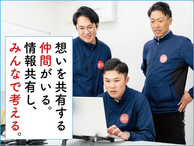 選考プロセス エントリー ▼ 書類選考 ※通過された方に 面接日などのご連絡いたします。 ▼ 面接(WEB面接可能) ※面接日時はご希望を考慮します。 ◎面接はお見合いの場だと思って 何でも遠慮なく聞いてください。 ▼ 内定 ※入社日は相談に応じます。 【HP】 https://crossage.com/