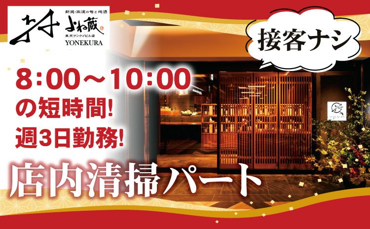 仕事内容 短時間・扶養内勤務OK!週単位のシフトなので柔軟に働けます。副業や家庭との両立にも最適! 【 お仕事のポイント 】 ・未経験・ブランクOK!丁寧な研修あり ・8:00~10:00の2時間シフト(短時間勤務) ・扶養内勤務やWワーク・副業にもピッタリ ・コツモク作業が好きな方に◎ ・土日のみ・平日のみも勤務も相談OK ・安定経営のよねグループ運営店舗 【 仕事内容 】 よね蔵 東京サンケイビル店(居酒屋)の店内の清掃を行う開店準備スタッフ(アルバイト)を募集しています。裏方業務に集中できるお仕事です。未経験の方も丁寧な指導があるので安心してはじめることができます。 主な業務は、 ・店内の床やホールや厨房のモップがけ、掃き掃除 ・テーブルや椅子の消毒や拭き掃除 ・店舗入口や看板などの外観清掃 短時間のお仕事なので朝だけ働いて午後は自由時間に扶養内で働きたい中高年、シニア層の方や主婦パート(主夫パート)さん、フリーター、Wワーク、副業など、シフトの⾃由度が⾼い職場で働きたい方にもおすすめです。ご経験をお持ちの方はもちろん、未経験の方やブランクがあって不安に感じている方も、1~2ヶ月の研修がございますので安心してはじめることができますよ。 美味しいまかないで、働きながらお腹も満たせるのも嬉しいポイント!さらに、お誕生日にはお店から“お食事券”のプレゼントもスタッフ想いのこうしたちょっとしたご褒美が、日々のモチベーションにつながります。 【 活かせる資格・経験(なくてもOK)】 ・掃除、清掃、早朝勤務、家事代行 ・ハウスクリーニング、客室清掃、軽作業 ・厨房、キッチン、洗い場など飲食店勤務 【 YONEKURAグループについて 】 よね蔵グループは1989年の創業以来、新潟の食材・食文化や地酒など地元生産者とのつながりを大切に、食の魅力を発信する地域活性化プロジェクトに取り組んでいます。飲食店経営をはじめ食肉小売業やカフェ事業など多角化経営で、時代とともに変化するニーズに寄り添い続け、2024年度県経済振興賞を受賞。雇用面では、独自の従業員教育システムを持ち、約830名の雇用を支えています。単身者用社宅完備でUIJターンや地方移住希望者にも柔軟な対応が可能です。 ハローワークで求職中の方や正社員のお仕事をお探しの方はもちろん、第二新卒、派遣、契約社員、Wワーク、短時間や短期アルバイト、主婦パートなどで在職・勤務中の方からの転職相談も受け付けております。 詳細や聞いてみたいことなどがありましたらお軽にご連絡ください。電話でのご応募も可能です。 TEL. 0256-64-7432(採用担当まで)
