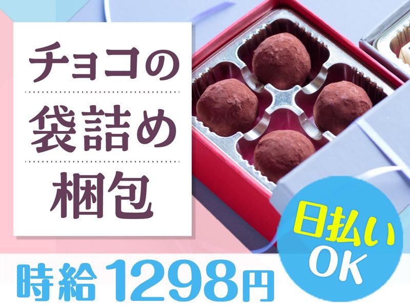 仕事内容 ▼シーズン限定!チョコの袋詰めや梱包♪  ̄ ̄ ̄ ̄ ̄ ̄ ̄ ̄ ̄ ̄ ̄ ̄ ̄ ̄ ̄ ̄ ̄ ̄ ̄ ̄ 有名チョコレートメーカーの チョコのギフトを扱うお仕事⭐ <具体的には> ✅箱の決められた場所に 包装されたチョコを置く ✅チョコの数を数えて箱に入れる ✅梱包されたギフトを段ボールに入れる ✅配送先ごとに仕分け など 難しい作業はないので 未経験でも安心です♪ リピーターの多い大人気の現場ですが 初めての方でもしっかり作業手順を 教えるのでご安心ください! わからないことがあれば 先輩staffが丁寧にサポートします★ チョコレートを取り扱うので現場は15℃くらい! パーカーなどの上着を羽織って作業するのを オススメしています♪ ⭐嬉しいメリットPOINT⭐  ̄ ̄ ̄ ̄ ̄ ̄ ̄ ̄ ̄ ̄ ̄ ̄ ̄ ̄ ̄ ̄ ̄ ̄ 【1】日払いOK(規定あり) 「急な出費のときに本当に助かる…」 「欲しいものがすぐに買えます♪」 「遊ぶ予定の前にサクッと稼いでます!」 【2】シフト自由 「無理なく働けます◎」 「スキマ時間を活かせます!」 「WワークOK」 ✅働き方は自由自在  ̄ ̄ ̄ ̄ ̄ ̄ ̄ ̄ ̄ ̄ ✨スキマ時間や空いている日を有効活用できる! ✨シフト制だからプライベート両立OK 志望動機は何でもOKです! 軽作業のお仕事未経験・ブランクも大歓迎! (*'▽')ぜひ面接でお話お聞かせ下さい♪