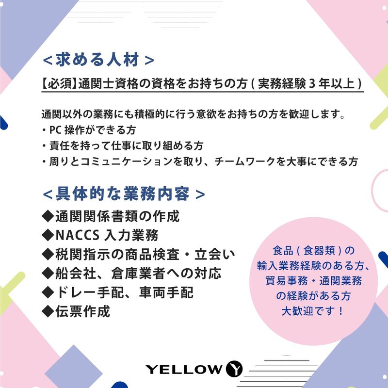 仕事内容 ✅:具体的な仕事内容♪  ̄ ̄ ̄ ̄ ̄ ̄ ̄ ̄ ̄ ̄ ̄ ̄ ̄ ̄ ̄ ̄ ̄ ̄ ◆輸出入通関書類、関係各所に 対する申請書類の審査 ◆NACCSを使用しての輸出入通関、 関係各所に対する申請業務 ◆税関指示の商品検査・立会い ◆税関職員からの問い合わせ対応 ◆船会社・倉庫業者への対応 ◆ドレー手配・車両手配 ◆伝票作成 ✅:経験や資格を活かして働ける♪  ̄ ̄ ̄ ̄ ̄ ̄ ̄ ̄ ̄ ̄ ̄ ̄ ̄ ̄ ̄ ̄ ̄ ̄ こんな経験・資格をお持ちの方… ◆通関士としての実務経験3年以上 ◆通関士資格取得の上、過去、 現在において通関士として 登録された経験のある方、 または登録されている方 ◆食品や食器類の輸入業務の経験者 ◆貿易事務や通関業務の経験者等 これまでの経験を活かしながら、 新しいことに挑戦したい方を大歓迎! 成長できる環境が整っていますので、 自分のスキルをさらに磨きたい方に◎