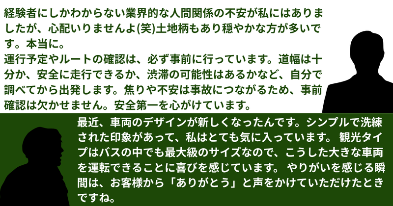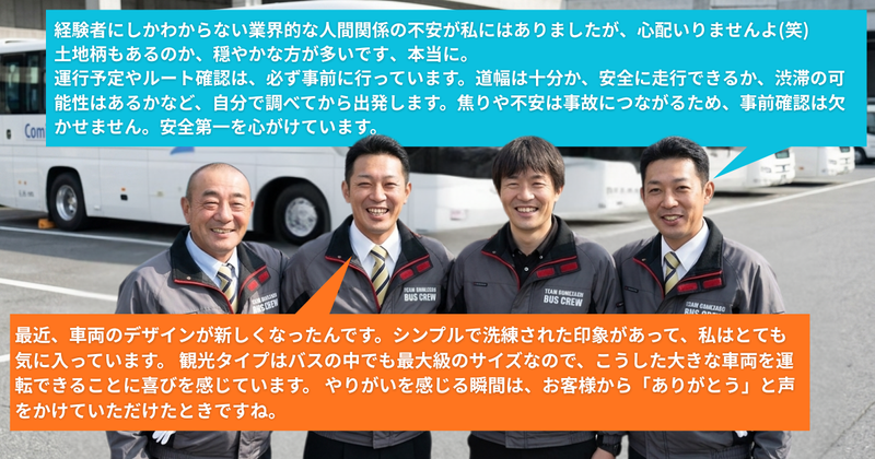 求めている人材 <必須条件> ・大型2種運転免許所持 ・観光バスの乗務経験6カ月以上 【こんな方にもピッタリ】 ・車の運転が好き、大きな車や乗り物が好き ・自分の生活スタイルに合わせて働きたい方 ・福利厚生が充実している企業で働きたい方 ・仕事とプライベートを両立させたい方 ・Uターン/Iターン就職を検討中の方 ・ドライバーのお仕事を探している方 ・自衛隊で活躍されていた方も多数在籍中! ✨コミタクモビリティーサービスで働く魅力 ╭━━━━━━━━━━━━━╮ 無理なく働き続けられる 会社を目指して 制度を整えています! ╰━━━━━━v━━━━━━╯ ◇ 働きやすい職場認定制度に認定! 職場環境の改善に取り組みながら、 従業員が長く働き続けられる仕組みを 目指しています。 ◇ 業界では珍しい、待機時間も 労働時間に含めます! 一般的には、ハンドル時間(走行時間) のみが労働時間としてみなされ、 お客様のご予定中の待機時間はお給与が 発生しません。弊社は、そんな待機時間も 労働時間としてカウントしてます! ◇ 独自の手当が充実! 例えば... 観光手当:観光業務に4時間以上付き添い 1日2,500円支給 中休手当:朝夕の送迎のうち昼間の 待機時間は一度帰宅可! ◇ デジタル勤怠管理ツールの導入! 8時間以上の勤務は分単位で 残業代支給します。 勤怠管理もわかりやすく楽ちん! ◇ 勤務外の時間は自由に! Wワークも副業もOK! プライベートの時間もきちんと 確保できる◎ 仕事とプライベートを切り分けることで 社員の満足度・幸福度につながると 考えています。 業務外の時間に副業することも可能です! ◇ 家族を第一に考える企業 女性だけでなく・男性の介護休暇 育児休暇の取得は、当社の重要な 取り組みの一つです。 働くすべての社員がライフイベントに 応じた柔軟な働き方を選択できることで、 より豊かな人生を送るお手伝いを したいと考えています。 実際に、育児休暇を3ヶ月取得した、 男性社員も在籍しています! ◇ 同業他社からの転職者も多数活躍中! ❁.。.:*:.。.✽.。.:*:.。.❁.。.:*:.。.✽.。.:*:.。.❁ ✅「家族との時間を増やしたい」方 → 週休二日制+希望休制度があるので、 有給を減らさずに希望日に お休みを取れます。 ✅人とのふれあいにやりがいを感じる方 → 「ありがとう」が直接もらえる仕事です ✅地域に根付いた仕事がしたい方 → 転勤なし&地元勤務だから長く働ける ✅閑散期にお仕事がない方 → 閑散期は企業社員送迎バス乗務が できます! 「介護で一時的に送迎バスに 切り替えることができた」などの声も♪ 安心して長く働くことができる 環境を作っています! ❁.。.:*:.。.✽.。.:*:.。.❁.。.:*:.。.✽.。.:*:.。.❁