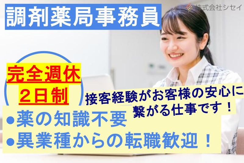 【仕事内容】 ●完全週休二日制 ●未経験OK ●ブランクOK ●無資格OK ●社内割引あり ●20代~40代活躍中 ●長期休暇OK(1週間休暇も取れます) ■調剤薬局の事務スタッフを募集します。 =========================== ママさん多数在籍!家庭と仕事を両立できる職場 =========================== 薬局で働く約7割の女性がママさんスタッフです。 育児をしながら働く方への理解もあるので、お子さまの行事や急な体調不良にも対応可能なシフト体制です。 “お互いさま”の雰囲気があり、サポート体制も充実した職場です。 ■具体的な仕事内容 ・薬の検品、検品薬の片づけ ・薬のピッキング 、分包機の操作 ・レセプト業務 ・在宅医療患者さんのお薬の準備・薬の配達(社用車有り) ・受付(患者情報などの簡単なデータ入力、電話・FAX 対応) 薬局勤務が初めてという方でも、データ入力からお教えするのでご安心! ※薬剤師も事務員も明るく笑顔いっぱいの雰囲気で楽しく働けます! ※薬についての説明は薬剤師が行うので、特別な知識はなくても大丈夫です! ■チャレンジのできる職場です 新人教育やイベント実行など、事務業務以外にも取り組むことができます。 キャリアアップとして、役職者を目指すことも可能です! いきなりのご応募は不安という方も是非見学だけでも歓迎です。 ご質問などもお気軽にお問い合わせください。 ご連絡・ご応募お待ちしております。 詳しく知りたい方は、「 株式会社シセイ 」で検索してみてください! 【求人ID-DI01】