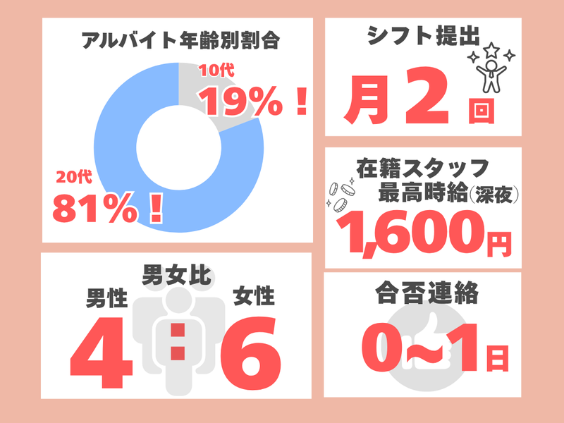 仕事内容 ◆ 働く魅力 ◆ ✅0〜1日で合否連絡!すぐにバイトを始めたい方にも◎ ✅学生中心で楽しい職場!同世代が多く、ワイワイした雰囲気で働ける環境です ✅シフト月2回提出。学校や遊びとも両立しやすく、無理なく続けられます ✅随時昇給あり!頑張りが給与に直結!深夜時給1,600円のスタッフも! ⭐️おしゃれ自由×学生メインのワイワイ職場 スタッフはほぼ学生(同志社や立命館など)で、明るくて楽しい雰囲気のお店。 飲み会や会社イベントのバーベキューなど仕事以外でも楽しみいっぱい! 髪型・髪色・ピアス・タトゥー・ネイルなども自由だから、自分らしく働けます◎ シフトは月2回提出で予定も立てやすく、学校や遊びとも両立しやすいのがポイント。 合否連絡は最短0〜1日。すぐ働きたい人にもおすすめです! ◆ 仕事内容 ◆ 【ホール業務】 ・お客様のご案内 ・料理・ドリンクの提供 ・会計対応、テーブルの片付け 【キッチン業務】 ・簡単な盛り付けや調理補助 ・仕込み作業(食材のカットなど) ・ドリンク作成 ・洗い場、キッチン内の清掃 未経験の方は、接客や簡単な業務からスタート! オーダーはQRなのでラクラク♪ 入社後はあなたの能力に合わせて先輩のサポートのもと丁寧にお仕事を教えていきますので、安心してください! ◆ 1日のスケジュール例 ◆ ※その日のシフトにより異なります 19:00 出勤 23:30 片付け、閉店作業開始 24:00 退勤!まかないあります♪ ⭐️この仕事の魅力 ✅ おしゃれ自由!自分らしく働ける 髪型・髪色・ネイルなども自由。ルールに縛られすぎず、自分のスタイルのまま働けるので、ストレスなく楽しく続けられます。 ✅ 仕事以外でも飲み会やバーベキューなどの交流がある! 当社のスタッフは社員・アルバイト関係なくとっても仲良し!退勤後にみんなで飲み会に行ったり、系列店舗と合同でバーベキューを行ったりと楽しいイベントが盛りだくさん!ただ一緒に働くだけの関係性ではなく、一緒に楽しむメンバーです♪ ✅ 社員登用あり!バイトからキャリアアップ アルバイトからスタートして、そのまま社員・店長へステップアップした実績もあり。「まずはバイトから」という方でも、将来を見据えて働ける環境です。 ✅絶品まかない付き!食費も節約できる お店こだわりの美味しいまかない付き。しっかり食べられて食費も抑えられるので、一人暮らしの方や学生にも嬉しいポイントです。
