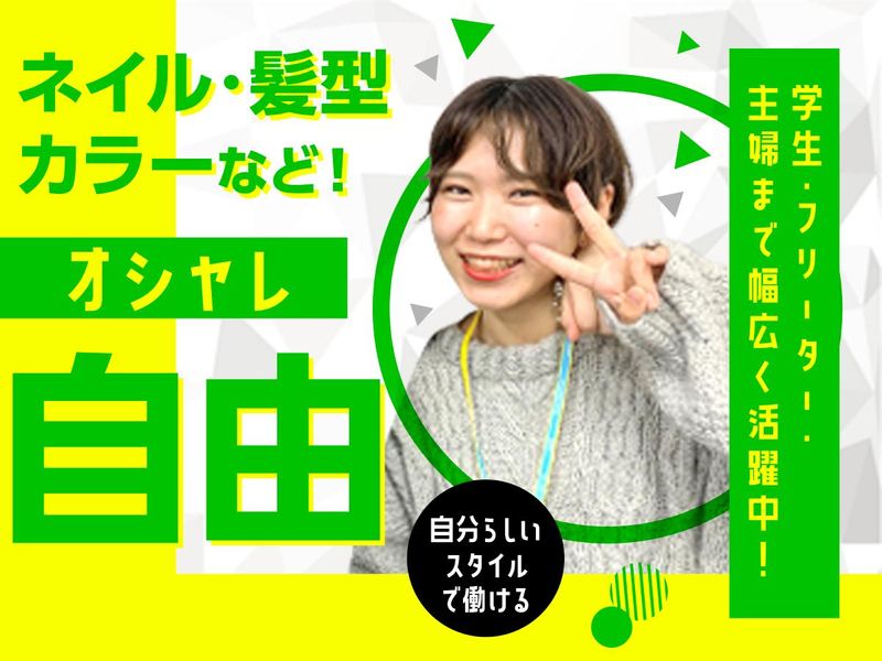 【保険制度】 雇用保険、労災保険、健康保険、厚生年金 待遇・福利厚生 【福利厚生】 ※派遣先により多少異なる *髪型・カラー・ネイル・服装自由(規定有) *日払いOK *友達と一緒ok *有給休暇有 *社員登用有 *Cポイント制度 *休憩室有 *研修制度有