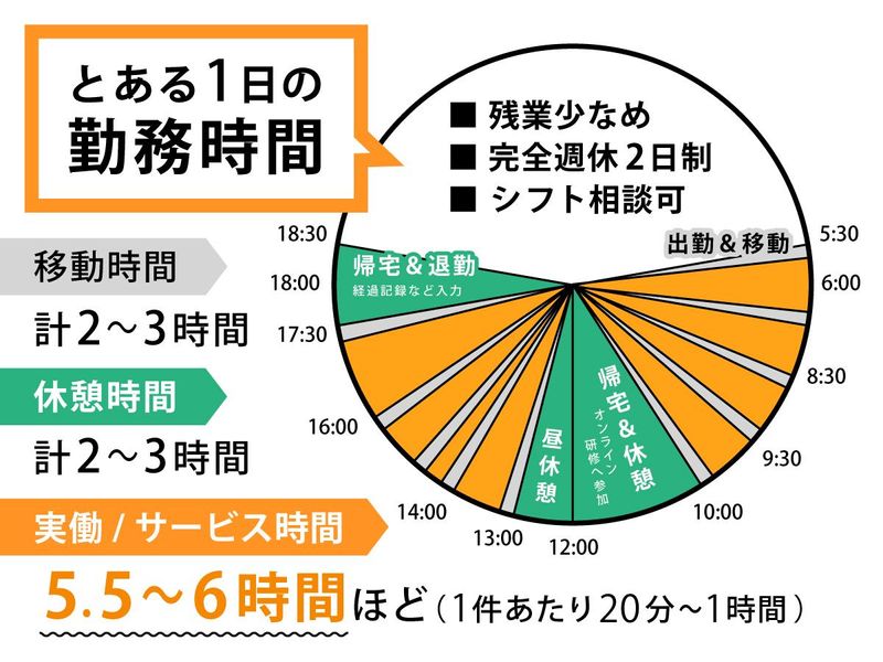 変形労働時間制 勤務時間詳細 総労働時間:1ヶ月あたり121時間 〜 132時間 【勤務時間】 早番|5:30~18:30 日勤|7:30~18:30 (1日実働5.5~6時間/休憩1時間/他移動あり) ※シフト制(1ヶ月の変形労働時間制) ※ほぼ残業なし(月平均残業時間20時間以内/自宅出発~帰宅までをしっかりカウントします) ※「社宅なし」は日勤・遅番メイン勤務(応相談) ※シフトにより夜勤をお願いする場合あり