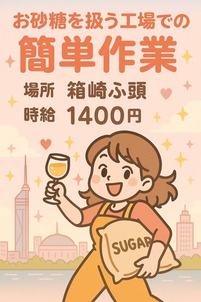 仕事内容 ◆お仕事内容◆ 砂糖を作っている工場での勤務です! ◎工場のサイクル◎ ・機械を動かして生産している期間 ・機械のメンテナンスをする期間 ・工場を休ませる期間 3つの期間のサイクルをまわして砂糖を作っています。 【機械を動かしている期間】(3週間前後) 基本的に機械1台に対し、1人作業または4人のグループで作業します。 ・紙袋やビニールの袋を機械にセット ・機械の起動と微調整 ・製品がはいった袋の目視検査し、パレットに積む作業 【機械のメンテナンスをする期間 】(1週間以内~2週間程度) ・機械のメンテナンスの補助作業 ・機械をアルコールで拭いたりする清掃作業 【工場休業期間 】 お盆や年末年始休暇などに当たります :+:・-・:+:・-・:+:・-・:+:・-・:+:・-・:+: ◆現場の環境◆ クリーンルーム内での作業です。 50~60名程度の方が働いている工場です。 生産を担っている工程の方は30名強で、製品ごとに4つのグループに分かれています。 幅広い年齢層の方が勤務しており、30代・40代が活躍中です。 :+:・-・:+:・-・:+:・-・:+:・-・:+:・-・:+: \\ アイニードで働くメリット // ◎圧倒的高時給 →どこよりも高い時給でお仕事をご紹介します! ◎福利厚生バッチリ →長く安心して働けますよ♪ ◎サポート体制抜群 →お仕事のことでの相談や質問など LINEや電話でいつでもご連絡ください! 些細なことでも構いません♪ ◎日払い週払い可 自分の好きなタイミングでお給料の受け取りが可 :+:・-・:+:・-・:+:・-・:+:・-・:+:・-・:+: ~ 応募から入社までの流れ ~ ◆応募 (応募フォームもしくはお電話にてご応募ください。) ↓ ◆お電話にて登録 5~10分程度 (勤務開始希望日や通勤方法、職歴など簡単にヒアリングさせて頂きます) ↓ ◆現場見学 (アイニードの担当が同行して実際の職場を見学します♪) ↓ ◆入社 (★★お仕事スタート★★) :+:・-・:+:・-・:+:・-・:+:・-・:+:・-・:+: __________最後に__________ 最後までご覧いただき誠にありがとうございます! 何か少しでも気になることや、ご要望などございましたら お気軽にお問い合わせください。 お会いできることを楽しみにしております♪ :+:・-・:+:・-・:+:・-・:+:・-・:+:・-・:+:
