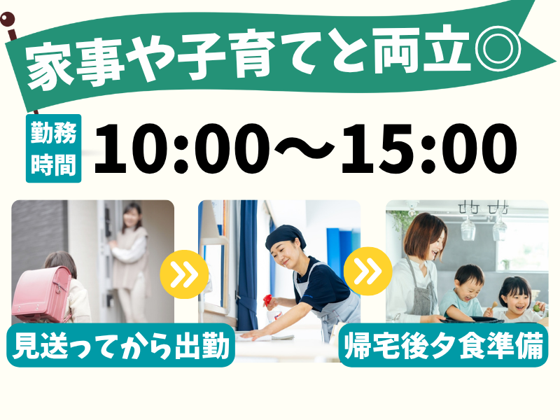 アピールポイント: ✅「家事の延長」感覚でお仕事OK! ・普段の掃除がそのまま活かせる ・体の動かし方も自然と慣れてるから安心 ・道具の使い方もカンタン♪ 「おうちの掃除感覚で気楽にできる」 そんな声がたくさん届いています♪ ✅ 15時にはお仕事終了♪ 夕方には家に帰れるから、 夕飯準備や買い物にも余裕アリ◎ 夕方以降は家族との時間を大切にできます。
