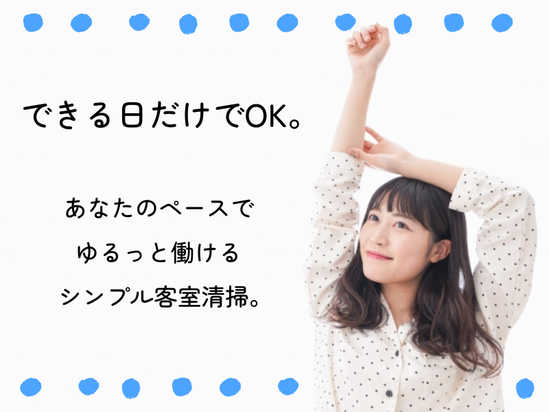 求める人材: 未経験者大歓迎! 30代・40代・50代まで活躍中! 主婦(夫)さん、学生さん、 副業・Wワーク(規定有)、 フリーターさんも歓迎です! 外国籍の方も活躍中! 扶養内勤務もOK!ご相談ください。 久しぶりの社会復帰でブランクがある方、 家庭と両立して働ける職場を探していた方、 ハローワークで求職中の方にもピッタリです。 ホテル清掃、ビル清掃、ベッドメイク、 家庭でのお掃除、軽作業、などの経験も もちろん活かせます。