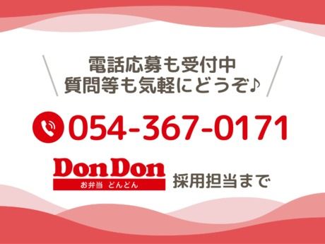 選考プロセス 〈1.応募〉Webまたはお電話から応募。 〈2.面接〉履歴書不要・服装自由。簡単な面接ですので、お気軽にご参加ください。ご質問やご要望も遠慮なくお聞かせください。 〈3.採用〉即日で面接結果をお知らせします。勤務開始日はご希望にお応えします。※応募の秘密は厳守します。 【問合せ先について】 問合せ先:054-367-0171 ご不明な点はお気軽にお電話又はメールにてご相談ください。 【メールお問い合わせ先】 株式会社どんどん本部 採用担当 saiyou@dondon.co.jp 応募方法 Webまたはお電話でご応募ください。Webの場合は、応募確認後、担当者よりメール返信します。 ※Web・お電話共に履歴書不要です。