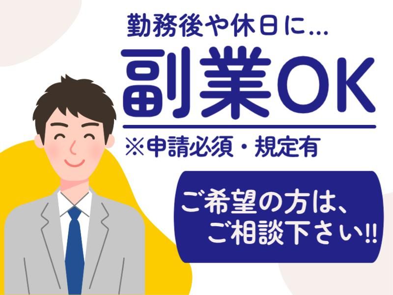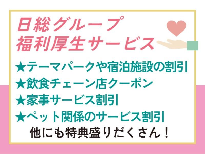 【保険制度】 雇用保険、労災保険、健康保険、厚生年金 待遇・福利厚生 【福利厚生】 ・社会保険完備 ・交通費規定支給 ・有給休暇(入社2ヶ月後に使用可) ・慶弔休暇 ・半休制度あり ・制服/保護具貸与 ・職場相談窓口あり ・友人紹介制度あり ・教育制度あり(研修制度充実) ・冷暖房完備 ・個人ロッカーあり ・仕出し弁当の注文可能 ・休憩所あり ・喫煙所あり ・無料駐車場、駐輪場完備(敷地内) ※各種規定あり 【副業OK(申請制)】 弊社が本業で仕事終わりや休日に副業を する事は可能です! 但し、事前申請制で弊社の就業規則が ありますので、ご希望の方はご相談ください。 【日総グループ福利厚生サービス使用可能】 旅行やグルメ、映画にショッピングなど、 娯楽に関する特典盛りだくさん! それ以外にも学習やライフサポートに関する 特典もあるので安心♪ <例> ★テーマパークや宿泊施設の割引 ★飲食チェーン店クーポン ★家事サービス割引 ★ペット関係のサービス割引