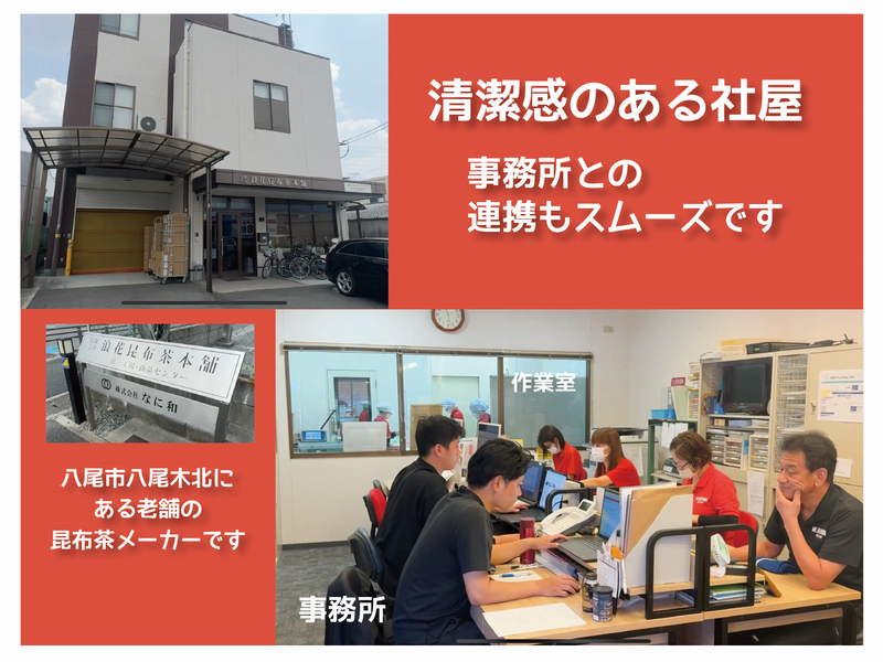 仕事内容 \ 主婦さんが中心に活躍中! / ★土日祝休み&14時迄で、働きやすさ◎ ★家庭と両立をしながら働ける環境! ―――*―――*―――*―――*――― 【 昆布茶の仕上げ作業 】 ✨袋詰め ✨缶詰め ✨箱詰め など…。 製造された昆布茶などの仕上げ作業をお任せします! 一日中同じ作業をする…なんてことはナシ! 3~4つのポジションでのお仕事なので、 飽きずに作業できますし、時間もあっという間☆ 【 ノルマ&ライン作業なし 】 時間や仕事量に追われることはありません◎ 落ち着いて作業に集中できるので、 未経験やブランクがある方もご安心を! お客様が安心してお召し上がりいただけるよう丁寧な作業をお任せしますね。 わからないことは丁寧にお教えしますので 気軽になんでも相談してください! ―――*―――*―――*―――*――― < 浪花昆布茶本舗について > 昆布茶を創り続けた経験と技術で色々な商品作りに挑戦しています。 飲んでほっこりする昆布茶ですが、使われるシーンが多いのはお祝い事。 最近ではホテルのウエルカムドリンク、美容室のサービスドリンクとしての提供も。 そんな昆布茶は、お料理の隠し味として使われることが増えてきました。 当社SNSでもレシピを多数投稿。 味覚を支える五味のうち、昆布茶は"旨味"の代表的な商品でもあります。 旨味の代表を作れるのだから、色んなものを作ろうとアイデアをもとに商品化。 お湯に溶かすだけのおだしやオニオンスープ、トマトスープ、カレースープ、お客様からの依頼で企画し作ったお茶漬けやふりかけ。 現在は各地方の商材を使ったラテやスープ等も数種類あります。 このように各方面から、多数の依頼を頂きます。 野菜を乾燥し粉末や顆粒加工をしてみたり… それを原料に新たな商品を作り出すお仕事はとても楽しく、完成時には感動します