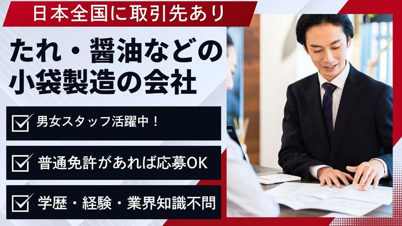 仕事内容 ╭━━━━━━━━━━━━━━━━╮ ✨食の“安心・安全”を支える営業職 ✨ ╰━━━━━━━━━━━━━━━━╯ 「食に関わる仕事に挑戦したい」 「営業として長く通用する力を身につけたい」 そんな想いをお持ちの方に向けた募集です。 当社は、食品業界に欠かせない 液体調味料(たれ・ソース等)の小袋製品を 食品メーカー向けに製造・提供している会社です。 今回は、将来を見据えた体制づくりのため、 未経験から育成する営業スタッフを募集します。 ✅【具体的な業務内容】  ̄ ̄ ̄ ̄ ̄ ̄ ̄ ̄ ̄ ̄ ̄ ̄ ̄ 食品メーカー・製菓会社などを中心に、 包装資材の提案営業を行います。 ・新規取引先への提案(訪問・電話) ・既存顧客への定期フォロー ・小袋製品(液体調味料など)の提案 ・見積作成、納品スケジュールの調整 ・社内(製造部門)との打ち合わせ ✅【未経験でも安心の育成体制】  ̄ ̄ ̄ ̄ ̄ ̄ ̄ ̄ ̄ ̄ ̄ ̄ ̄ 入社後は、先輩社員と同行しながら 商品知識・業界の流れ・営業の進め方を学びます。 いきなり成果を求めることはありません。 営業の基礎から段階的に身につけられる環境なので、 営業未経験の方も安心してスタートできます。 ✅【この仕事のやりがい】  ̄ ̄ ̄ ̄ ̄ ̄ ̄ ̄ ̄ ̄ ̄ ̄ ̄ 提案先は食品メーカーの開発担当者など。 商品に合った小袋仕様を一緒に考え、 スーパーやコンビニで 自分が関わった商品を目にした瞬間の達成感は格別です。 身近な「食」を支える仕事だからこそ、 社会とのつながりを実感できます。 最後までお読みいただきありがとうございます。 少しでも気になった方は、ぜひご応募ください。 食の安心・安全を支える営業として、 あなたの新しい一歩をお待ちしています。