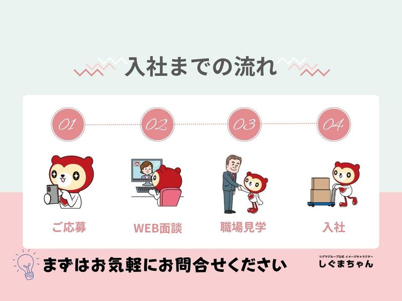 選考プロセス ※5/2~5/6までに頂いた応募は 面談日が5/7以降となります。 最後までお読みいただき ありがとうございます! 応募後、弊社応募管理システムより 面談日時設定のメールをお送りします! ご希望の日時を入力してくださいね♪ 「少し話しを聞いてみたいな。」 「もう少し詳しくしりたい。」 「他のお仕事はないの?」 …などの お問合せだけでも大歓迎! まずはお気軽にご応募ください(b'▽')b ╭━━━━━━━━━━━╮ ⏩お電話でのご応募もOK アカウント登録不要! ╰━v━━━━━━━━━╯ TEL:092-292-8077 受付:平日9:00~18:00 ▲応募後上記番号から電話する場合あり 【選考フロー】 応募 ↓ 面談(WEB面談1回/30分程) ↓ 職場見学 ↓ 入社 【面談ってどんな感じ??】 お仕事のご説明と、働き方のご希望を お伺いする簡単な面談です。 雑談ベースで進めますので、 初めての方やブランクのある方も 安心してご参加ください。 所要時間は30分ほど! 服装は私服でOK! リラックスして普段どおりお話し いただければ大丈夫です♪ 【迷われている方へ】 「まだ在職中だしな…」 「他の企業とも迷う…」 そんなお声もお聞かせください! ◎WEB面談実施中 ◎最短当日OK ◎職場見学OK ◎履歴書不要 ◎面談は私服でOK