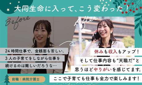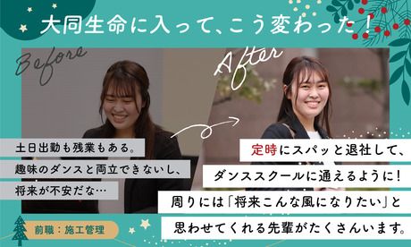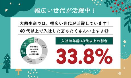 職場環境 【従業員構成】 当社社員の入社時の平均年齢は【34.5歳】(2023年度) 自分自身の新しい人生を歩みたい方を大同生命は応援します! 「家庭に専念していたが復職したい」 「子育てと両立し働きたい」 などの理由で入社される主婦・子育てママさんが多数います。 【この仕事を通して身に付くこと】 「働きやすさ」「長く勤めている女性の多さ」「年齢不問」という点に魅かれて入社した人が多数! 未経験でも活躍できている理由は、研修制度にあります。 ビジネスマナーや税務、マネジメントなど、年次・役職に応じて種類豊富にご用意。さらに、PCで視聴できるなど、個々人の必要に応じて学べる環境を整えています。 また、資格取得も推奨。「ファイナンシャル・プランニング技能士」3級はプランナーの6割が取得済です。