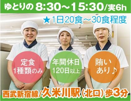 仕事内容 \働く方に楽しい食事を/ 安心の大手企業内!社員専用食堂♪ 【勤務地】駅チカ通勤楽々♪ 西武新宿線/久米川駅 北口歩3分 (東村山市栄町一丁目) ◎調理スタッフさん募集! (調理経験等活かせます) <ここもポイント♪> ◆1日20~30食程度の昼食調理♪ ☆☆定食1種類のみ☆☆ 【具体的には】 ・献立表に沿った昼食等の調理 (日替わり定食1種類) ・仕込み、盛付け、提供 ・簡単な事務など 【勤務時間・曜日】 8:30~15:30/休1h・実6h ★月~金曜/週5日(祝休み) 【休日・休暇】 完全週休2日制(土・日・祝) GW・年末年始・他企業カレンダー ★年間休日120日以上でオフも充実♪ (お子様のいらっしゃる方にも大好評) ◆ゆとりの勤務も人気! (月収/17万8200円以上可) 【社員食堂で働くメリット】 ✅働き易く安定した勤務時間♪ 社員食堂は企業の営業時間等に合わせて運営されており、中でも平日のランチタイムが中心です♪ ✅お客様は常連(社員やスタッフさん等) 社員食堂のお客様はその企業で働く社員やスタッフさんがほとんどなので、とてもアットホームな環境です♪笑顔いっぱいの「美味しかったよ~」「ごちそうさま」も大きなやりがいです♪ ✅嬉しい食事補助(美味しい賄い)♪ 昼食代節約&お弁当の手間も不要♪ ✅ご家庭での調理にも役立つスキル 調理方法や衛生管理の知識もゲット! ✅他、飲食業等とは異なる休日♪ 各企業等の休日と合わせる社員食堂がほとんどなので、土・日・祝日やGW・年末年始休暇もあるのが人気の理由。 【当社概要】 ・企業事業所給食/首都圏約200店舗! ・ISO14001取得