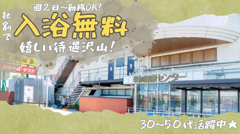仕事内容 ★流行りのサウナで話題★ 草加健康センター  ̄ ̄V ̄ ̄ ̄ ̄ ̄ ̄ ̄ ̄ ̄ ̄ ̄ ̄ ̄ ̄ ̄ ̄ ̄ 飲み物や食べ物の調理になります。 麺をゆでたり、揚げ物を揚げる 簡単仕事です。 まずはお客様に笑顔で対応をお願いします! キッチン・ホール関係なくお客様から 顔が見えるので「笑顔」はとても大切です! メニューを覚えるのが 少し大変かもしれませんが、 仕事をしているうちに 覚えていくので安心してくださいね! 週2日~、18:00~OK! 「短時間だけ」「フルタイムで」 「夕方から短時間で働きたい 「日中は本業でWワーク先として」 「学校終わりに働きたい」など 夕方の時間を有効活用しているスタッフが 多数在籍中! あなたらしいペースで活躍できますよ! <こんな方は大歓迎!> ・正社員、アルバイト、パート問わず飲食店 居酒屋・カフェでの勤務経験がある方 ・キッチンスタッフ・カフェスタッフ 調理・調理補助経験者の方 ・30代活躍中、40代活躍中、50代活躍中 ・学生、Wワーク、フリーター歓迎 【嬉しい特典がたくさん!】 温泉施設ならではの入浴無料特典や、 施設内のお食事がお得に 3割引きで食べられたり! 楽しみながらお得に 働くことが出来ちゃいます!