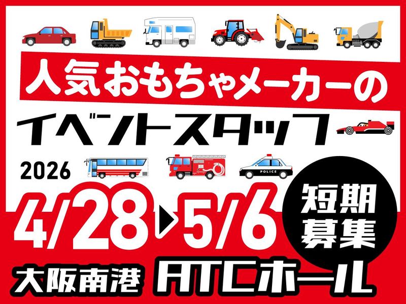 仕事内容 ◆◆――――――――――――――――― <GW限定>短期のみのお仕事! 特別な経験ができる「イベントスタッフ」 ―――――――――――――――――◆◆ 【GW期間限定】 本番4/28(火)~5/6(水) ※研修4/27(月) 研修参加はマストになります。 子どもから大人まで幅広い世代に愛される おもちゃイベントの運営を行います。 【どんなお仕事?】 ATCホールで行われる おもちゃメーカーのイベントスタッフとして イベント運営業務全般をお任せします。 >>具体的には ・来場者の案内や誘導 ・特設ショップでの販売業務 …など 難しい業務は一切ありません。 楽しく働けるお仕事です♪ 【勤務地】 大阪南港ATCホール 【服装】 集合時 ・黒綿パンツ ・無地のスニーカー(華美でないもの) ※茶髪、ヒゲ、ネイル、ピアスはNGです 本番時 ・つなぎを貸与します。 ※つなぎの中に着るハーフパンツ、ジャージなど持参ください。 ≪サポート体制万全≫ 業務についてはしっかりレクチャーするので、 未経験の方も安心してスタートできます◎ ≪達成感を味わえる≫ 世界中から愛されるおもちゃのイベント! 大勢の仲間たちと一緒にイベントを成功させるという やりがいや達成感を実感できます♪ 来場されるお客様が楽しんでいる様子も嬉しい◎ ≪期間限定で稼げる≫ GW期間のみのお仕事! 集中してしっかり稼げるので、 学生さん・主婦(夫)さんをはじめ フリーターさん・Wワーカーさんまで 幅広い方が活躍できる好環境です◎ *…*…* ★当社の魅力 ――――――――――――――― 私たち『ティーアールワイ』は 全国で行われる さまざまなイベントを支えています! スポーツのビッグイベントから 地域を盛り上げるお祭りやフェスまで 「ワクワク」を作る現場をサポートしてきました。 未経験の方も大歓迎♪ しっかりフォローするので 初めてでも安心してスタートできます! 楽しい仲間と一緒に、イベントを盛り上げていきましょう☆