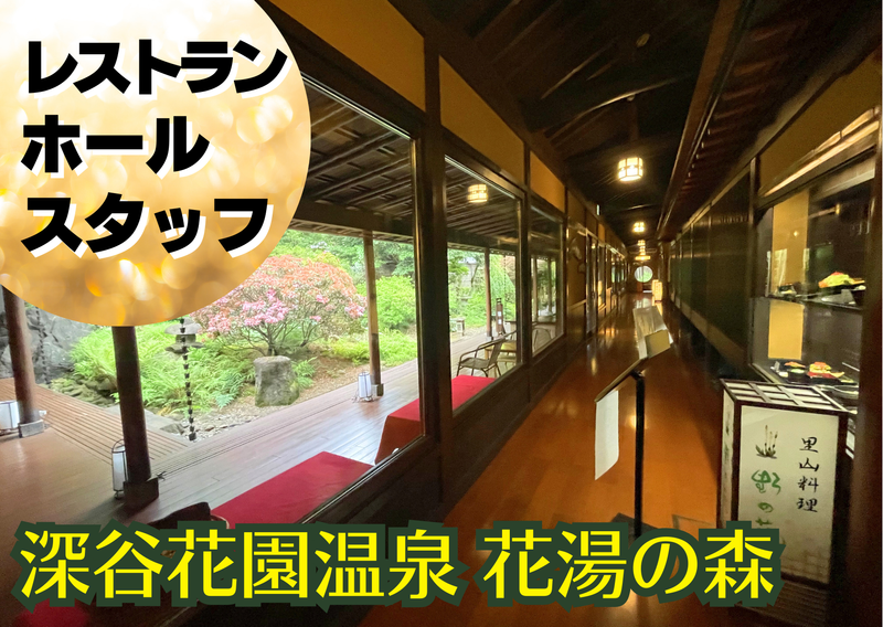 仕事内容 =================== 自然の中にとけ込んでいるような癒し空間♪ 心も体もリラックスできる大人の隠れ家♪ 深谷花園温泉 花湯の森でホールスタッフ募集 =================== 【お仕事内容】 花湯の森内レストランでのホール・接客スタッフ 【具体的には】 ・お客様のご案内やお料理の提供 ・片付け、洗い物など 笑顔で丁寧な対応ができれば未経験の方でも大歓迎!! 難しい内容はないので、未経験の方でも楽しく働けます♪ *主婦さん・パートさん活躍中 *フリーターさんも大歓迎 *嬉しい無料入浴特典あり *扶養内勤務OK ✅学生・主婦・Wワーカーさん歓迎 応募→面接→採用→すぐに働けます★ =====================