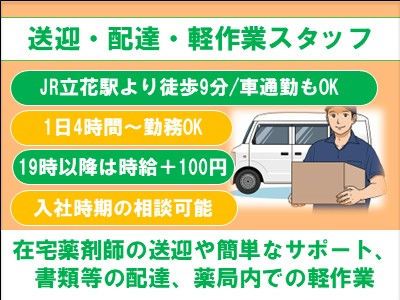 【雇用形態】 アルバイト・パート 【職種】 送迎・配達・軽作業スタッフ/1日4時間程度で可 【仕事内容】 ・社用車(軽/AT可)にて在宅薬剤師の送迎 ・原動機付き自転車での書類交換など ・在宅診療時の簡単なお手伝い (薬剤師の指示のもと、お薬手帳に情報シートをはったり、輸液を運搬を行っていただいたり、薬剤師が持っているiPadに入っている訪問カレンダーをセットしてもらったり、というようなお手伝いです。完了後は薬剤師も再度確認しますのでご安心ください) ・書類等の配達、受け取り ・薬局内の軽作業のお手伝い (薬局内の清掃、お薬カレンダーのカード作成など、お手伝いできそうな範囲での雑務をお任せします) 【仕事の特徴】 ◆当薬局について◆ 2021年12月に新築移転オープンした 3階建ての薬局です。 薬局内にはエレベーターもございますので ご安心ください♪ ◇1階:薬局 ◇2階:研修室・休憩室など ◇3階:当直室(代表のみが使用します) 働くスタッフも、 良い職場環境で勤務していただくために 職場環境も整えています♪ ー (以下参照) ・床暖房あり ・個人ロッカー完備 ・休憩室あり ・研修室あり ・クリーンベンチ有 ・USBやコンセントの差し込みが可能な カウンターテーブル有 アルバイト・パート,年間休日120日以上,未経験者歓迎,業界未経験者歓迎,フリーター歓迎,第二新卒歓迎,主婦・主夫歓迎,ブランクOK,経験不問,週2・3日からOK,週4日以上OK,シフト制,扶養内勤務OK,転勤なし,少人数の職場,車通勤OK,バイク通勤OK,自転車通勤OK,交通費支給,40代も応募可,50代も応募可,職場見学可