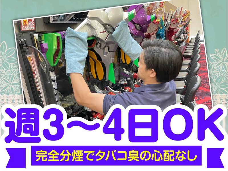 仕事内容 \\早朝に2時間だけの勤務★//  ̄ ̄ ̄ ̄ ̄ ̄ ̄ ̄ ̄ ̄ ̄ ̄ ̄ ̄ ̄ 朝の時間を有効活用♪ 週3~4日出来る方募集(^^)/ 40~60代活躍中♪  ̄ ̄ ̄ ̄ ̄ ̄ ̄ ̄ ̄ ̄ ̄ ̄ ̄ ̄ ̄ 開店前の時間帯で作業を行うので接客なし! スキマ時間でサクッと働きたい方にピッタリ◎ ≪具体的な業務内容≫ ✅パチンコ台拭き ✅パチンコ玉拾い ✅床清掃 ✅トイレ清掃 ✅ゴミ回収 など チームで分担して作業を進めるので 負担が少なく、残業ナシで 無理なく働ける環境です。 …………………………………… ✨家事の延長で働けます!✨ …………………………………… 清掃に使う道具で特殊なものはなく、 作業自体もとても簡単なので 普段のお掃除が得意な方であれば 清掃業未経験の方も大歓迎◎ 接客なしで黙々と働けますよ! …………………………………… ✨20代~60代まで活躍中✨ …………………………………… 子育てが落ち着いて復職した主婦さんや 定年後のお小遣い稼ぎで働くシニアまで 幅広い年代の方が活躍中♪ 別のお仕事との掛け持ちもOK! ご家庭の都合や本業、私生活に合わせて 無理なく続けられるお仕事です◎ …………………………………… ✨週3~4日、1日2時間で募集✨ …………………………………… 週3~4日勤務出来る方募集('ω') 基本的に残業はありません♪ 曜日問わず働ける方大歓迎♪