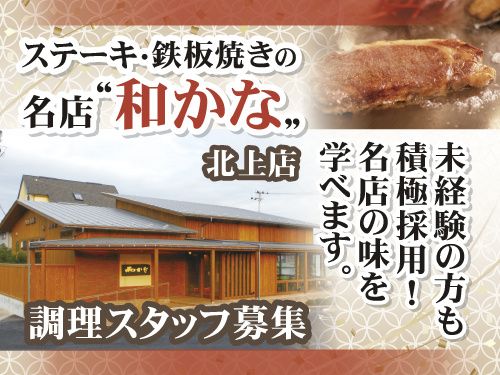 仕事内容 未経験からスタートできる! ステーキ・鉄板焼きの名店「和かな」にて 調理スタッフを募集いたします。 「主なお仕事内容」 〇食材の準備(肉や野菜の下ごしらえ、ソースの仕込み) 〇調理サポート(盛り付けや皿の準備など) 〇接客業務(お客様の案内、注文受付、料理提供) 〇鉄板での調理(経験を積んだ後、シェフとしてステーキ・鉄板焼きを調理) などをおまかせいたします。 入社後は、仕込みや調理補助、接客サポートなどの基本業務からスタート。 先輩スタッフが丁寧に指導するため、飲食未経験の方も安心して働けます。 経験を重ねれば、鉄板焼きシェフとして ステーキや鉄板料理を担当するステップアップも可能です。 調理や接客のスキルを基礎から身に付けたい方に最適な職場です。 「こんな方におすすめです」 〇飲食業界に興味はあるけれど未経験で不安な方 〇人と接することが好きな方 〇調理や接客のスキルを基礎から学びたい方 〇地域に根ざした安定したお店で長く働きたい方 北上市にある「和かな北上店」は、 昭和35年創業の地域に根差した老舗レストランです。 地元のお客様から観光で訪れる方まで幅広い層に愛され、 60年以上にわたり培った確かな技術と「食の喜び」を提供しています。 「最後に」 「和かな北上店」では、一人ひとりが安心して成長できる環境を整えています。 食の喜びを一緒に届けてくださる方のご応募をお待ちしています。