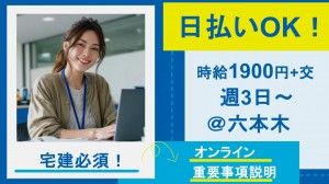 仕事内容 \【宅建資格】活かせるお仕事!オンラインで重説!/ ◯ご入居者さまに向けた重要事項説明をおまかせします! ・重要事項説明 *テレビ電話・Web会議ツールなどを用いてご対応いただきます ・紛争防止条例の説明 ・電話業務(取次ぎ、掲載物件の確認など) ・契約書の内容チェック、訂正 ・付随する事務業務 など *宅建資格&重説のご経験を活かせるお仕事です!