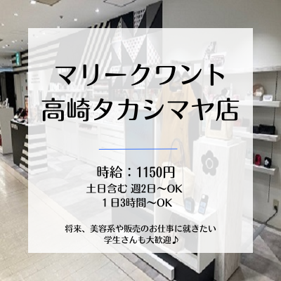 仕事内容 ⭐マリークワントショップでの化粧品・アパレル雑貨の販売⭐ コスメやファッション・アクセサリーなどの 多彩な商品をお客様にご案内するお仕事です。 ≪具体的には…≫ ⏩お客様へコスメ、ファッション商品のご提案 ⏩店舗のレイアウト変更 ⏩商品や備品の補充 ⏩店舗の清掃 etc. タッチアップの業務はないので 未経験の方でも安心してお仕事できます。 \こんな方にオススメ/ 学生・フリーターなど20~30代中心に活躍中!! 将来、美容系や販売のお仕事に就きたい 学生さんも大歓迎♪ 募集職種:アルバイト