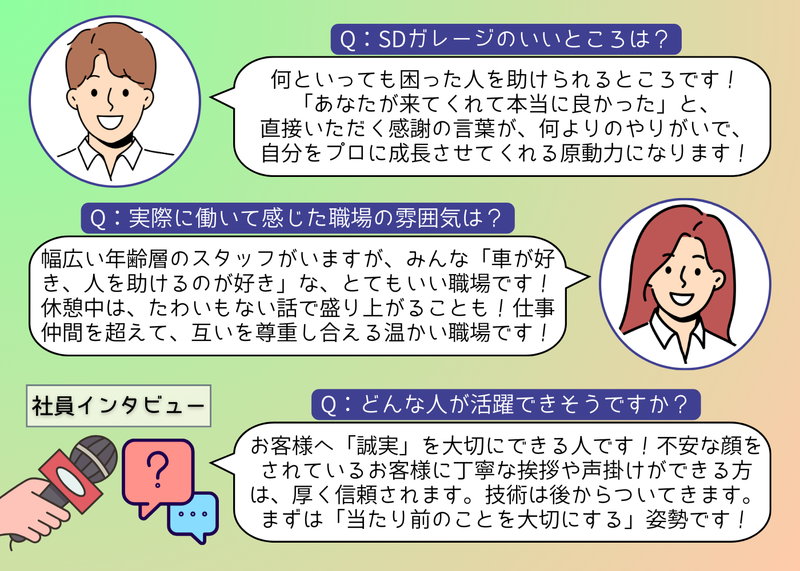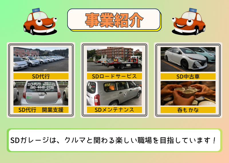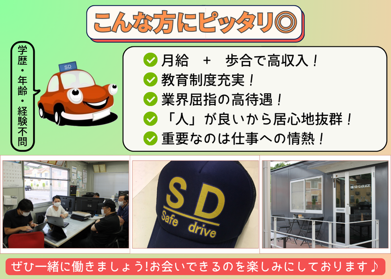 仕事内容 \\ロードサービス★松戸・柏エリアJAF指定工場// ロードサービスドライバーとして、故障車や事故車の救援業務をお任せします! 何といっても強みは「人」!社員への教育・給与・待遇を充実させて、お客様に愛されるブランド企業を目指しています! ✅働く魅力  ̄ ̄V ̄ ̄ ̄ ̄ ̄ ̄ ̄ ̄ ̄ ̄ ̄ ̄ ̄ ̄ ̄ ̄ ✨月給 + 歩合で高収入! ✨教育制度充実! ✨業界屈指の高待遇! ✨「人」が良いから居心地抜群! ✨地元密着で愛される企業へ! ✨重要なのは仕事への情熱! ✅仕事内容  ̄ ̄V ̄ ̄ ̄ ̄ ̄ ̄ ̄ ̄ ̄ ̄ ̄ ̄ ̄ ̄ ̄ ̄ ◆積載車ドライバー ・故障車、事故車の搬送 ・バッテリー上がり、エンジン未始動、パンクなどの応急対応業務 ◆車両積載・運搬対応 ・JAF依頼による故障車・事故車の救援 ・積載車での車両搬送 ◆サービスカードライバー ・バッテリー上がり、エンジン未始動、パンクなどの応急対応業務 ⭕仕事への情熱がある方大歓迎! しっかりとスキルを身につけることができます! ✅自動車整備士免許があれば、未経験OK!  ̄ ̄V ̄ ̄ ̄ ̄ ̄ ̄ ̄ ̄ ̄ ̄ ̄ ̄ ̄ ̄ ̄ ̄ ̄ ̄ 学歴・経験は一切不問です! 「車が好き」 「接客の経験を活かしたい!」 「手に職を身につけたい」 そんな気持ちがあれば大歓迎です✨ 当社のスタッフは、多彩なバックグラウンドを持つメンバーばかり! しっかりと「教えてもらえる」文化が根付いています。 ✅選考からご入社までの流れ  ̄ ̄V ̄ ̄ ̄ ̄ ̄ ̄ ̄ ̄ ̄ ̄ ̄ ̄ ̄ ̄ ̄ ̄ ①書類選考(履歴書と職務経歴書必須) ②面接 ③体験研修(当社隊員と同乗し実作業を体験していただきます) ※時給をお支払いいたします! ④内定 ※正社員雇用契約 (試用期間(2ヶ月)※給与同条件) ⑤実務同乗研修(作業を習得していただく研修です) 入社後のギャップが無いように、しっかりサポートいたします! 安心してご応募ください! ✅株式会社SDガレージとは?  ̄ ̄V ̄ ̄ ̄ ̄ ̄ ̄ ̄ ̄ ̄ ̄ ̄ ̄ ̄ ̄ ̄ ̄ 弊社は、運転代行・ロードサービス事業を展開する地域密着型企業です! 松戸市を拠点に、お客様の約80%がリピーターという高い信頼をいただいており、 「安心して任せられる存在」として着実に成長を続けています。 弊社の自慢は、単なる「運転」だけで終わらない仕事の幅広さと、 何よりスタッフ同士の絆の深さ。 異業種から転職してきた仲間たちが、 一つのコミュニティのように互いを高め合いながら活躍しています! ✅社員インタビュー  ̄ ̄V ̄ ̄ ̄ ̄ ̄ ̄ ̄ ̄ ̄ ̄ ̄ ̄ ̄ ̄ ̄ ̄ ✨この仕事のいいところは? 何といっても困った人を助けられるところです! 「故障で不安だったけど、あなたが来てくれて本当に良かった」と、 現場で直接いただく感謝の言葉が、何よりのやりがいであり、自分をプロに成長させてくれる原動力になります! ✨実際に働いて感じた職場の雰囲気は? 幅広い年齢層のスタッフがいますが、みんな「車が好き、人を助けるのが好き」な、とてもいい職場です! 休憩中や待機時間は、たわいもない話で盛り上がることも!単なる仕事仲間を超えて、お互いを尊重し合える温かい雰囲気です。 ✨どんな人が活躍できそうですか? 目の前のお客様への「誠実さ」を大切にできる方なら絶対に向いています! 不安な顔をされているお客様に丁寧な挨拶や声掛けができる方は、現場でも仲間からも厚く信頼されます。 技術は後からついてきます。まずは「当たり前のことを大切にする」姿勢がある方なら大歓迎です! ✨最後に、応募を考えている方へメッセージを! SDガレージのロードサービスは、「感謝であふれる仕事」です。 現場で車両を積み込み、無事にお届けした時の「本当に助かりました!」という言葉は、何度聞いても嬉しいものです。 「人の役に立ちたい」「高収入とやりがいを両立したい」という方、ぜひ安心して飛び込んできてください!