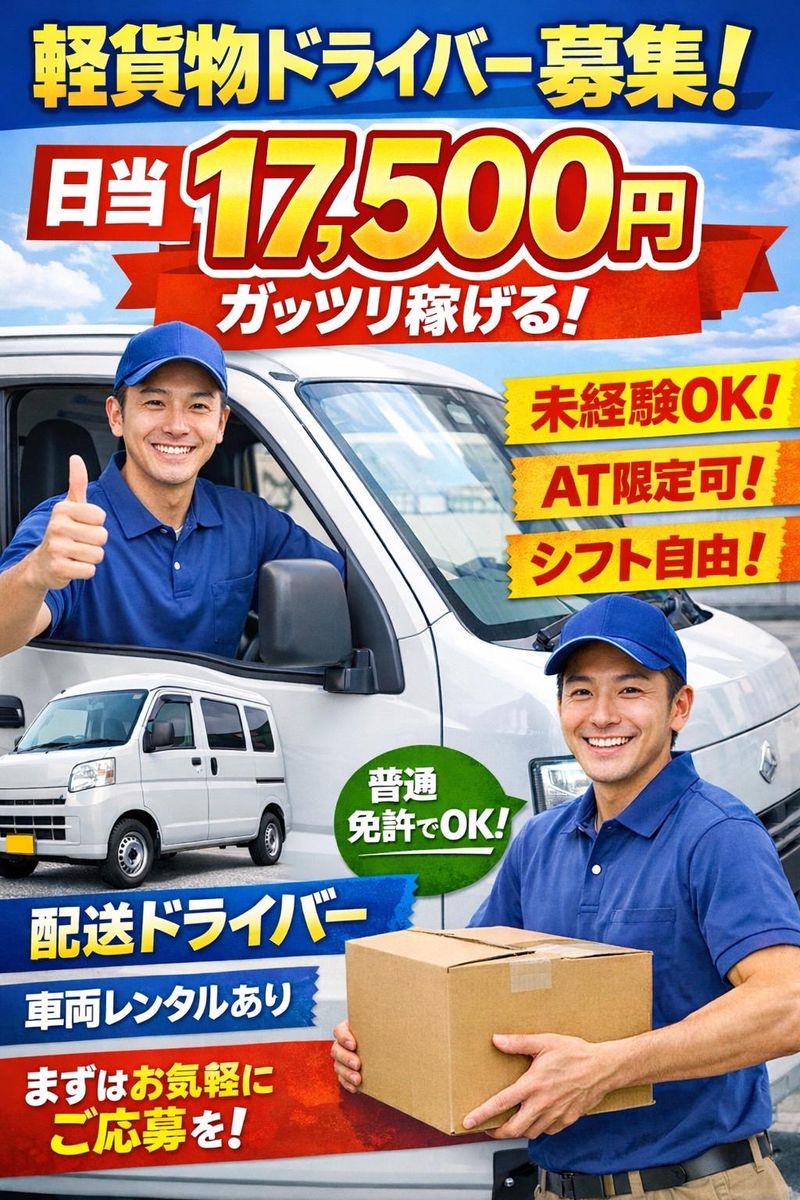 求めている人材 ■必須条件 ・普通自動車免許(AT限定可) ■歓迎条件 ・運転が好きな方 ・ドライブが好きな方 ・一人で黙々と作業するのが好きな方 ・決められたことを確実にこなせる方 ・しっかり稼ぎたい方 ・配送業務経験者 ・運送業経験者 未経験の方も大歓迎です! 最初は先輩社員と一緒に乗り作業して いただくので安心してください。 2日もあれば覚えられる仕事内容なので、 初めての方でもすぐに慣れることができます。 人柄重視の採用なので、経験やスキルが なくてもOK! 学歴不問!やる気があればOKです! がっつり稼ぎたい方には特におすすめ!! 一人で黙々と作業したい方、車の運転が 好きな方にぴったりのお仕事です。