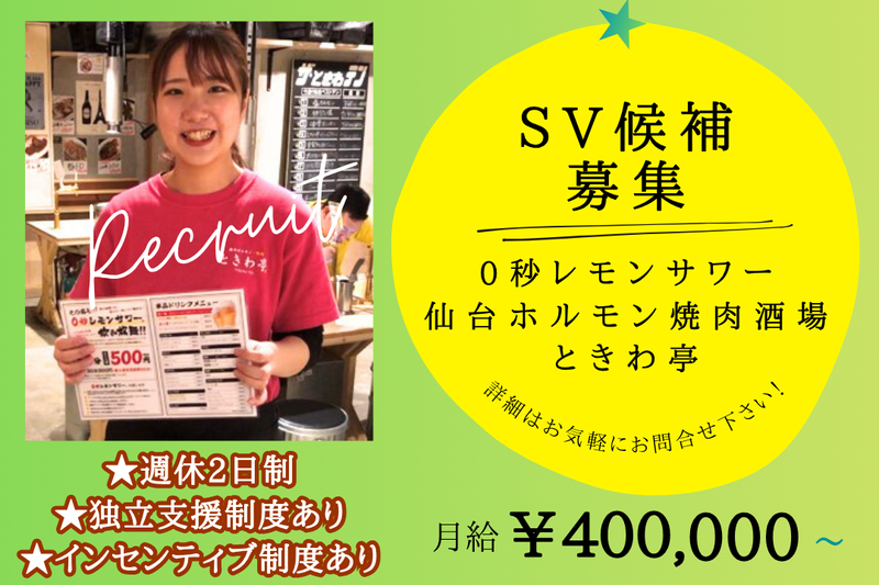 仕事内容 ○●○●○●○●○●○●○● 月給40万円~דリーダーを育てる会社” <<レイリーフードテック>> × <<0秒レモンサワーときわ亭>> 次のキャリアをつかむ“SV候補”募集 ○●○●○●○●○●○●○● \レイリーフードテックで働くポイント/ ★ 全員インセンティブ制度 → チームで成果をわかちあう文化 ★ “役職ではなく役割”を重視する、 人が育つ組織 ★ キャリアステップ明確 → 一般→店長→SV→部長→独立も ★ 飲食×マーケ支援の多角経営 → 成長性と安定性の両立 ★ 独立支援制度あり (店長経験3年~、資金含め伴走) ··—··—··—··—··—·· 【仕事内容】 まずは現場で “店を動かす力” を 身につけたうえで、複数店舗の成長を 支える立場へステップアップしていく ポジションです。 ◆ 店長・リーダー層の育成・コーチング ◆ 複数店舗の運営改善・課題抽出 ◆ 売上/原価/人件費など数値管理と対策立案 ◆ 成功事例の横展開・オペレーション標準化 ◆ 新店立ち上げや既存店の立て直し支援 など 「自分で回す店」から 「育てられる店長」を生み出す立場へ。 成長企業だからこそ、 組織をつくる面白さを実感できます。 ··—··—··—··—··—·· 【レイリーフードテックってこんな会社!】 代表の飯田・村上は、 元々同じ飲食企業で働いていた仲間。 「自分たちの力で、お店や人の未来を つくれる会社をつくりたい」 その想いから、2022年に レイリーフードテックを創業しました。 掲げたミッションは “ライズリーダー(リーダーを輩出する)”。 ★ 役職ではなく「役割」で評価する ★ 人が育てば、会社は強くなる ★ 「入ってよかった」と胸を張れる職場にする この価値観を軸に、 評価・研修・キャリア制度のすべてが “人を育てるため”に設計されています。 現在は、水戸・つくば・いわきにて 6店舗を展開。2036年に100店舗、 上場を目指し、拡大中です。 さらに、私たちは “飲食だけの会社”ではありません。 SNS運用支援、 マーケティング支援などの事業も行い、 地方企業が「勝てる仕組み」を つくる力にもなっています。 そして今、より大きな成長を見据え、 グループ会社 「レイリーホールディングス」を設立。 今後はM&Aを含め、 飲食以外の領域にも挑戦していきます。 “数字にコミットする”プロの視点と、 “想いや理念に寄り添う” 人間的な関わりを両立させながら、 地域から挑戦する人と企業を 増やすことを目指しています。 → 飲食×人材育成×マーケ支援 を軸にした多角展開のため、 会社としての成長性・安定性が 両立しているのが大きな強みです。 ··—··—··—··—··—·· 【展開ブランド】 ・0秒レモンサワーときわ亭(FC) ・串かつのぶた。(自社業態) ・鮨酒肴 杉玉(FC) 【『0秒レモンサワーときわ亭』について】 卓上サーバーから“0秒”で レモンサワーが注げる人気業態。 焼肉は「ダクト換気でコロナ禍でも 勝てる業態」として選び、 タブレット注文・セルフ提供で効率化。 働く人にもやさしいお店設計 です。 ··—··—··—··—··—·· 【ここが魅力!】 ◆ 評価は“リアルタイム推薦制” SV・店長が日常での成長を見て、 必要なタイミングで昇格を推進。 ◆ インセンティブは全員対象 個人戦ではなく“チームで勝つ”文化。 ◆ 育成に強い会社 数字管理・マネジメント・リーダーシップなど “店長で終わらない人材”をつくる研修体制。 ◆ キャリアステップが明確で速い 一般 → トレーナー→マネージャー → 主任 → 副店長 → 店長代行 → 店長 → リーダー → SV → 部長 + SNSマーケチームの道にも挑戦可能 ◆ 実績 ・副店長入社 → 2ヶ月 で店長代行 ・店長入社 → 約1年 でSV昇格 ◆ 独立支援あり(店長3年〜) 資金/計画/運営ノウハウまで伴走。 特に 「串かつのぶた。」は独立モデルとして相性◎ ◆ 待遇面もしっかり ・昇給あり ・決算賞与(業績による) ・全員インセンティブ ・家族手当 (子ども1名につき1万円) ・まかない ・資格取得支援 (衛生/防火管理者など会社負担) ・ネイル・髪型自由 ・車/バイク通勤OK(駐車場あり) ··—··—··—··—··—·· 「仲間と店をつくる。 自分の力で未来を切り開く。」 レイリーフードテックは、今まさに拡大期。 新しい店舗・新しいポジションが 次々と生まれているため、 “役職の空き待ち”はありません。 実際に、入社数ヶ月での昇格や、 店長 → SV へのスピード昇進も多数。 その背中を見て、“アルバイトから社員へ” チャレンジしたメンバーもいます。 “誰かの活躍が、次の挑戦を生む”。 そうやって、 成長の連鎖が続いている会社です。 その面白さを、 ここで一緒に味わいませんか? 応募はお早めに◎