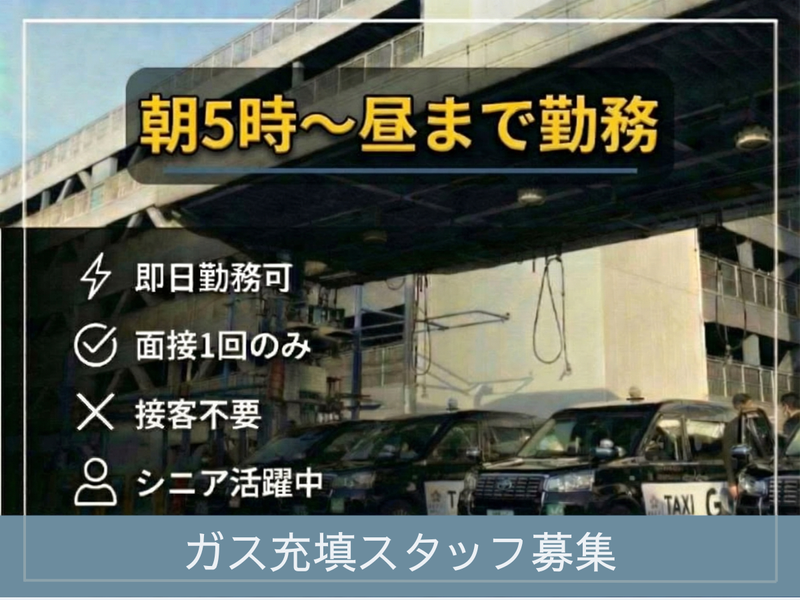 仕事内容 ――――――――――――――― 【電話応募OK‼】 TEL:03-5970-9325 ※ガソリンスタンドの求人を見たとお伝えください! ――――――――――――――― \ ここがポイント! / ◆週3日~、午前中勤務 ◆ミドル・シニア応援企業 ◆丙種化学責任者の資格を活かせる ◆タクシー会社の敷地内で安心 ◆残業ほぼなし、深夜業務もなし ◆浴場など施設利用可能 日本交通グループ内で トップクラスの実績を持つ当社。 企業の安定性はもちろん、 福利厚生がしっかり整っています。 安心して長く働けますので、 ぜひご応募ください。 【 仕事内容は… 】 タクシー車輌へのLPガス充填 ※入社後の研修で丁寧にお教えします 窓拭きなどの洗車は ドライバーが行うのでありません。 シンプルワークのため、 無理なく長く続けられます。