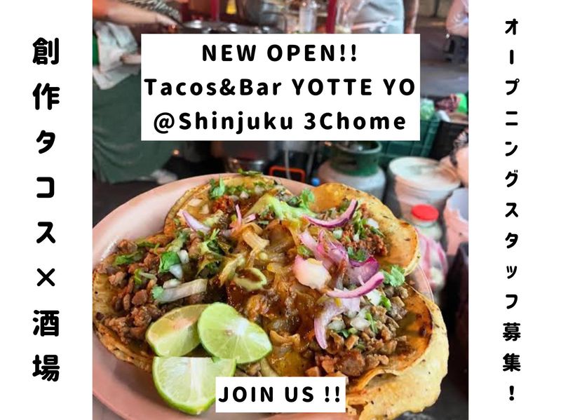 仕事内容 【オープニングスタッフ募集♪】 2025年8月初旬オープン予定! 新しい仲間と一緒にスタート! 「Tacos&Bar YOTTE YO」は、新宿に誕生する創作タコスがウリの酒場。 落ち着いた雰囲気で、色んな方とお話できる環境です。 オープニングスタッフだから、みんなが一緒のスタート! 「こんなメニューやサービスがあったらいいな」そんなアイデアも大歓迎! ◆具体的なお仕事内容 ・お料理の配膳 ・簡単な料理の盛り付け ・ ドリンク作成 ・お会計業務 ・お客様のお迎え、お見送りなど... ◆◇◆働く魅力ポイント ◆◇◆ ✅ 新店舗なのでオープニングスタッフとして働ける ✅ 駅から徒歩5分の好立地 ✅ 未経験からでもしっかりサポート ✅ 美味しいまかない付き!