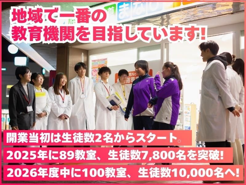 職場環境 / 私達と一緒に地域で一番の 教育機関を作りませんか? \ 開業当初、 生徒数2名からスタート ▼ 2025年に89教室、 生徒数7,800名を突破! ▼ 2026年度中に100教室、 生徒数10,000名を 目指しています! 喫煙所:なし(敷地内全て禁煙)