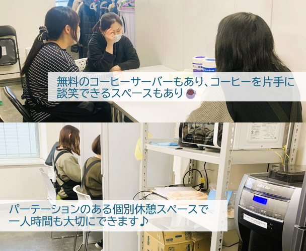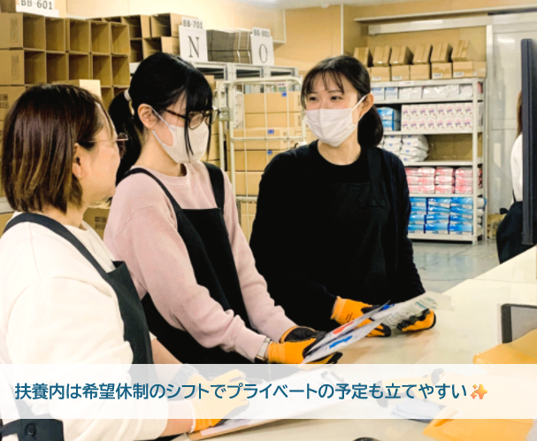 勤務時間詳細 【フルタイムパート】 ・平日のみ勤務 ∟週5日勤務 ∟9:00〜18:00 ・土日祝休み ・年間休日125日! ※扶養内パートの場合 ・シフト制 ∟ 土日祝日含む週3~4日勤務 ∟ 10:00~15:30 ※実働5時間30分 (9:00~14:30勤務も応相談) ・お休みは希望休制(固定曜日休希望はご相談ください) ・月80時間程度の扶養範囲内でのお仕事! ・お子さんの学校行事など、シフトの相談に応じます!