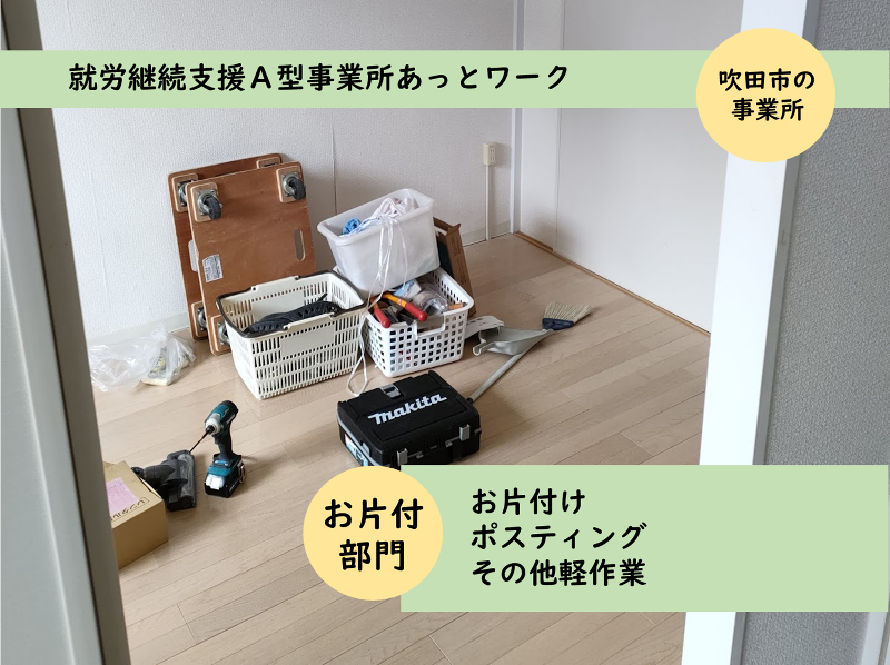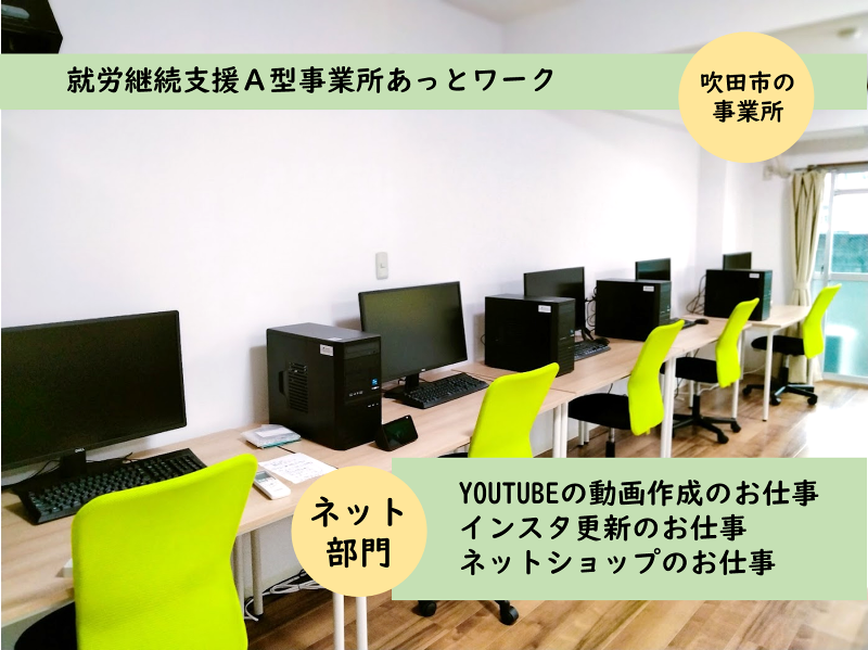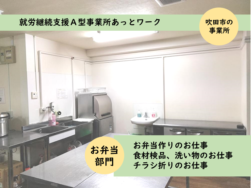アピールポイント: ⭐弊社は同じマンションに就労A型あっとワーク、就労A型あっとワークプラスを運営しています。 ⭐「お弁当のお仕事」「メルカリ・インスタ・youtubeのお仕事」「お片付けのお仕事」を行っています。 ⭐ほとんどの方が未経験から始められています。 ⭐働きやすい環境作りに力を入れています。採用基準は人柄なのでいい人ばかり。 ⭐時間に余裕を持たせているのでご自身のペースで働くことができます。 ⭐分からないことや不安なことはスタッフがフォローしますので安心です。 ⭐相談室完備。職員はいつでも味方になります。一人で悩むことはありません。 ⭐一般企業への就職をバックアップします! ・自己分析 ・履歴書の書き方 ・面接のシュミレーション ・お仕事探し ・就職後も支援します