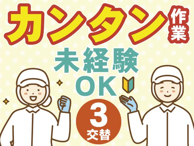 仕事内容 レトルト食品や調味料などの製造に関わるお仕事です! カンタン作業!未経験でも安心してスタートできます! <お仕事内容> 食品工場で冷凍された材料を専用の機械に投入するだけ! 具体的には… ①機械に決められた材料を投入 ②あとは調理や製造を機械が進めます ③調理後、材料を次の工程の人に渡す ①・②・③の繰り返しのお仕事となります。 材料は20キロ程度のものもありますが、 複数人で行う作業なので安心してください! 特別な経験・資格は必要ナシ! 作業内容をしっかり教えてゆくので、 未経験者の方でも安心してスタート出来ます。 <オススメポイント> ・カンタン&モクモク作業 ・稼げる3交替 ・月収例23万円以上可 ・未経験OKのお仕事 ・嬉しい長期休暇あり ・車の中での休憩OK(無料駐車場有) ・作業服無料貸与 ・20代~30代の男性活躍中 <こんな方におすすめ> ・すぐに働きたい方 ・今、働いているパート・アルバイトより収入を得たい方 ・体を動かすのが好きな方 ・食品工場でのお仕事経験をお持ちの方 <週払い&前払い制度あり> お給料日前や入職前も安心!お気軽にご相談ください。 <派遣が初めての方も安心!> 面接から入社・入社後まで、同じ担当者がサポートいたします。 働きたい時間帯や休日の希望など、ぜひお気軽にご相談ください。