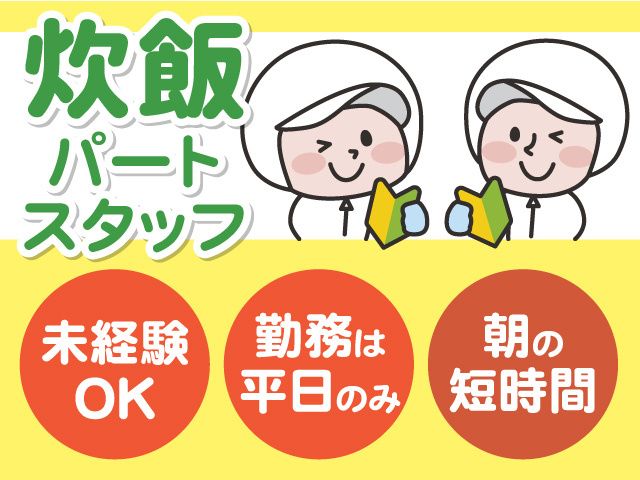 仕事内容 パートスタッフ募集! ///////////////////////////////////////// 〇朝のみ短時間! 〇週3日~5日勤務 〇年齢不問・経験不問 〇1日4~4.5時間程度勤務 ///////////////////////////////////////// 事業所向け給食お弁当を製造・販売を 行っている企業で炊飯スタッフのお仕事です。 【主な業務内容】 機械によるお米の精米、 炊飯、盛付けをお願いします。 <未経験者OK> 4:00~8:30または9:00までの 実働4時間~4.5時間の短時間勤務です。 スキマ時間を活用して働けます。 <勤務は平日のみ!> 週末休みでメリハリをつけて働けて プライベートの時間もしっかり確保できます。 週3日~5日で勤務ご相談ください。 <年齢・経験不問> 機械の操作方法など 一から丁寧に指導いたしますので 未経験の方もご安心ください。 少しでも気になった方は まずはお気軽にお問い合わせください。