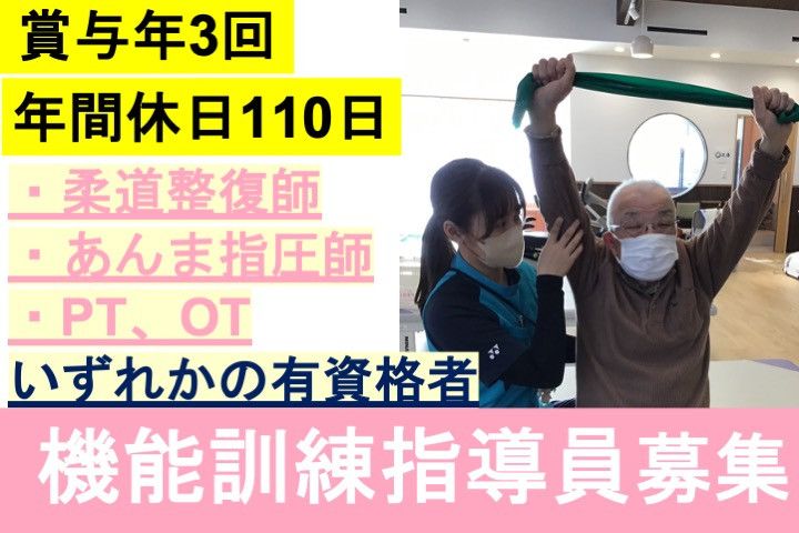 【雇用形態】 正社員 【契約期間】 試用期間3ヶ月。その後、無期雇用。 (試用期間中の条件変更なし) 【その他】 リハビリの専門職、理学療法士(PT)、作業療法士(OT)、の資格を活かした求人をお探しの方、必見です。機能訓練型デイサービスにて機能訓練指導員を募集いたします。 柔道整復師、あん摩マッサージ指圧師の資格をお持ちの方で、介護施設やリハビリテーション施設での勤務に興味がある方はいらっしゃいませんか。 訪問リハビリをされていた方、介護老人保健施設や特別養護老人ホーム、デイサービスやデイケアなどで通所リハビリをされていた方もお力を貸してください。 当デイサービスは人柄重視。思いやりと感謝の心を持ち、地域の高齢者の方に寄り添ったアットホームな雰囲気の職場を目指しています。 言語聴覚士や看護師・准看護師の資格をお持ちの方向けの求人もあります。ブランクがあっても大丈夫。まずは一度お話ししてみませんか。 ハローワークなどで「扶養家族手当あり」「完全週休二日制」の機能訓練指導員の正社員求人をお探しの方からのご応募もお待ちしています。