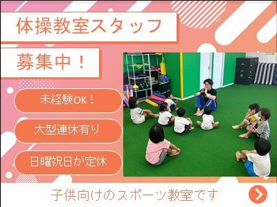 【アピールメッセージ】 無資格・未経験OK*費用会社負担の資格取得支援あり*実働6.5h 残業少なめ*子ども体操教室のトレーナー(正社員)募集! 弊社は兵庫県初のFC加盟店としてオープンし、子どもたちを中心にスポーツや体操・運動の指導を行なっております。 ***毎回応募殺到の人気の職種!!採用でき次第、応募終了予定*** 生徒数増加の為、スタッフ増員募集します! ■子ども体操教室の体操指導スタッフ(正社員)募集! ■体作りやトレーニング・スポーツの指導などをおまかせします。 ■園児向け・小学生向け・中学生向けクラスが中心(大人向けクラスもあり) 無資格・未経験からチャレンジできるお仕事です! 充実した研修制度もございますので、経験不問でも活躍可能です* 異業界・異業種からの転職をお考えの方も歓迎します! [オススメポイント] ・経験不問・資格不問 ・資格取得支援制度あり(費用全額会社負担) ・残業ほとんどなし ・実働7時間 ・日祝定休 ・出産、育児支援制度あり など JR「大久保駅」より徒歩5分で通勤ラクラク* まずは見学のみもOK!お気軽にお問い合わせください! ~明石店について~ 2023年7月オープンしたまだまだ新しい教室です* 現在、10代・20代・30代の男女スタッフが活躍してくれています イベント企画やSNS運用・トレーニングメニューの提案など、新たな視点からのアイディアもお待ちしています!