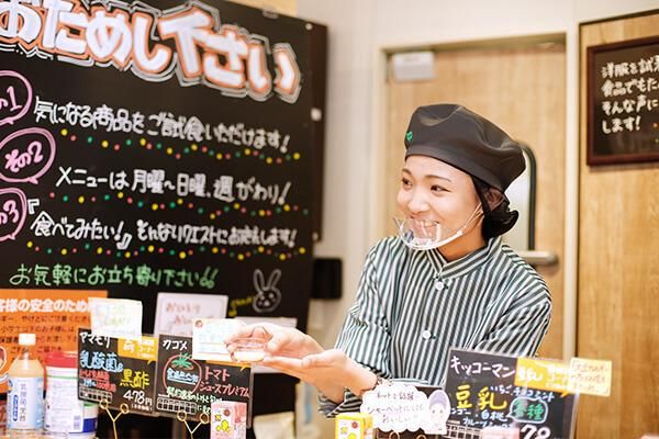 【試食販売】髪色・髪型自由!ピアス・ネックレス・指輪もOK!お洒落とお仕事の両立出来ちゃいますよ。 週3日~、未経験OK★主婦(夫)の方や学生さん・フリーターさんなど大歓迎! \ 未経験からの挑戦を応援します / 活躍している人のほとんどが、イチからのスタート! 最初の何も分からない状態から みんなをリードする存在に成長しています◎ あなたのことも、 チーフや先輩が丁寧に支えるのでご安心を★ まずは基本から慣れていき、 それから応用をマスターしていけばOK! 自分のスキルアップを実感できるからやりがいバツグンですよ◎ 一緒に活気あるお店を目指して頑張っていきましょう! < あなたらしく働けます > 身だしなみの基準を大幅に緩和! 安全や衛生面のルール内なら、髪色や髪型は自由。 ネックレスもOKです♪