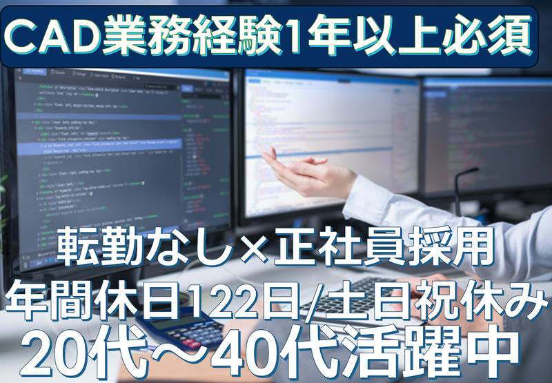 求めている人材 <必須条件> ・CADの使用経験が1年以上の方 <歓迎条件> ・2D、3DCADソフト経験のある方 ✨資格やスキルについては、充実した研修制度があるので着実にスキルアップできます。