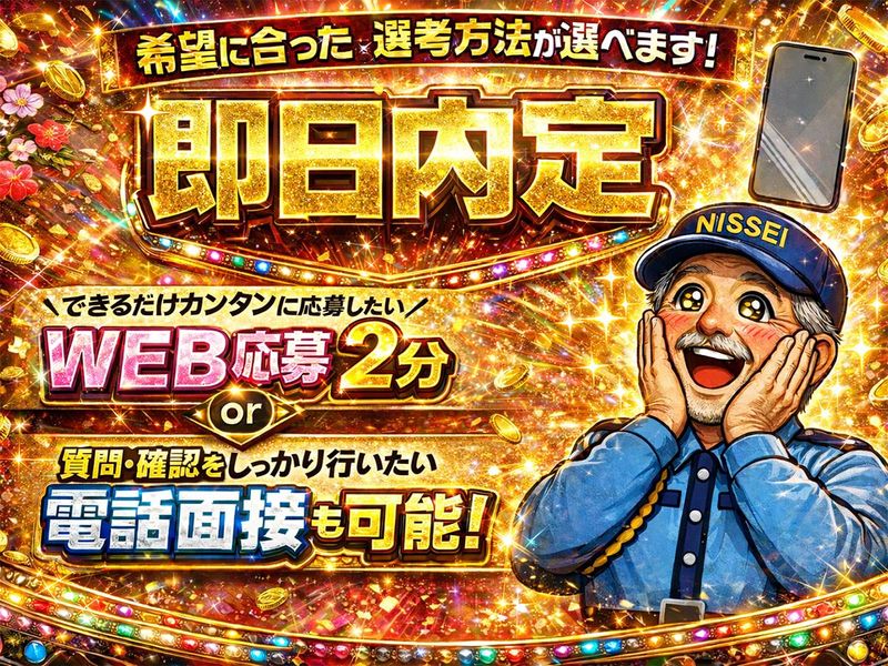 仕事内容 ★業界内で高水準の高待遇★ ✅選べる選考フロー ①WEBの質問に答えて面接なしで即内定 ②面接をしてから決めたい方⇒電話面接⇒即内定! ✅すぐに貰える祝金(最大16万円) ✅日払い(来社不要) ✅制服預り金なし - シンプル業務×力仕事ナシ 豊富な案件でしっかり入れる♪ 老後に向けて稼ぎたいも大歓迎 - ★レアバイト 電車関係で仕事をしていた人・鉄道好きな人・興味がある人 様々な人が活躍中です!! 電車の間近で働ける普段中々体験出来ない仕事です♪ *具体的には・・・? 鉄道線路内、線路近接で工事をする、 作業員の安全を守る仕事です!! ・列車や重機が作業員と接触しないよう監視 ・線路の点検や工事の際に線路付近で列車運行の確認 etc ☆幅広い層が活躍中!★☆ 日制警備保障では、 20代~60代の幅広い年齢層が活躍中◎ 「今後の為に稼いでおきたい!」 「何歳になっても働いていたい!」 そんな方大歓迎です! ☆★希望通りのシフトが叶う★☆ 案件が豊富にあるので、 「シフトに全然入れない…!」 なんてことはありません◎ ↓実際にこんなに稼ぐ方も!↓ <50代 Sさんの場合> 夜勤+日勤 月25日稼働 =33万5810円 年齢に関係なく稼いでいきたい! そんな方にピッタリです♪ ■年金受給者応援 年金と合わせて月51万円まで就業が可能で、 受給額の減額もなく安心して働けます。 ■老後の安心と充実 老後に向けた貯蓄や、健康維持・社会参加 の場としても最適です。 「老後も収入を得たい」「趣味や生活に充実をプラスしたい」という方にぴったり。 ■柔軟な働き方が可能 シフト調整が可能なので、ご自身の生活リズムや体調に合わせて無理なく勤務できます。 ライフワークバランスを取りながら安心して働ける環境です