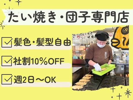仕事内容 メニュー少なめ&シンプルな作業のみ★ 焼いて~♪包んで~~♪「はい!どうぞ!!」 週2日、1日3h~勤務OKの超柔軟シフト◎ 未経験歓迎!10~60代まで活躍中♪ ======================== 和スイーツ(たい焼き・みたらし団子)の 製造・販売スタッフのお仕事です! 未経験・ブランクの方でも安心して 働ける環境をご用意しています♪ ◆仕事内容  ̄ ̄ ̄ ̄ ̄ ̄ ̄ ̄ ̄ ̄ *機械を使ったシンプルな製造作業 *接客やレジの対応 *店内の簡単なお掃除 ...など クルクル回して→お団子完成♪ 型にタネを流し入れて→→たい焼き完成♪ 未経験の方でもスグにできるお仕事です♪ ◆入社後  ̄ ̄ ̄ ̄ ̄ ̄ ̄ ̄ ̄ ̄ テイクアウト専門店ですので、 接客はレジ対応のみ! スイーツの製造もマニュアルがあるので 難しい作業は一切なし♪ 未経験の方・ブランクがある方・ アルバイトデビューの方でも、スグに活躍できます◎ ==◇==◇==◇==◇==◇==◇== \\未経験◎初バイト&ブランク歓迎// 誰もが、みんな最初は未経験からスタートしてます♪ 出来なかった事が出来るようになるのって楽しいですよね! 私達も同じスタートですので、 一緒に成長していけたら良いなと思っています♪ \\超柔軟シフト♪週2日,1日3h~可 // 希望シフト提出で働きやすさ抜群! 平日のみ、週末のみなど都合に合せて働ける♪ お気軽にご相談くださいね♪ 学校終わりや、お休みの日に働きたい学生さん・ 平日の空き時間に働きたい主婦(夫)さんも大歓迎! 年金との収入調整も可能です♪ \\テイクアウト専門でメニュー少なめ// メニュー少なめで製造業務もかんたん☆ レシピ通りにたい焼きの餡子を包んだりetc… 誰でも美味しい和菓子が作れます! また、テイクアウト専門店ですので接客も最小限♪ \\髪色OK♪個性を活かせる// 一緒に働くスタッフさんには、 私生活もしっかり楽しんで頂きたいと思っていますので、 髪型・髪色など、全て自由!個性を大事に働けます★ (飲食業ですので、清潔感は大切にしています♪) \\全国に180店舗を展開する安心母体// 全国に180店舗を展開する安定した企業が母体なので、 扶養内勤務やライフスタイルに合わせた働き方も相談しやすい環境です♪ 長期で無理なく働きたい主婦(夫)さんにもおすすめです! \\本求人のPOINT// ◆10~60代までの学生さん・主婦(夫)さんが活躍中! ◆平日or週末のみ/昼のみ等、好きな時間で働けます♪ ◆未経験OK◎初バイト&ブランク大歓迎! ◆超柔軟シフト★週2日、1日3h~勤務可◎ ◆髪色・髪型自由!オシャレもOK♪ \\本求人のPOINT// ◆10~60代までの学生さん・主婦(夫)さんが活躍中! ◆平日or週末のみ/昼のみ等、好きな時間で働けます♪ ◆未経験OK◎初バイト&ブランク大歓迎! ◆超柔軟シフト★週2日、1日3h~勤務可◎ ◆髪色・髪型自由!オシャレもOK♪