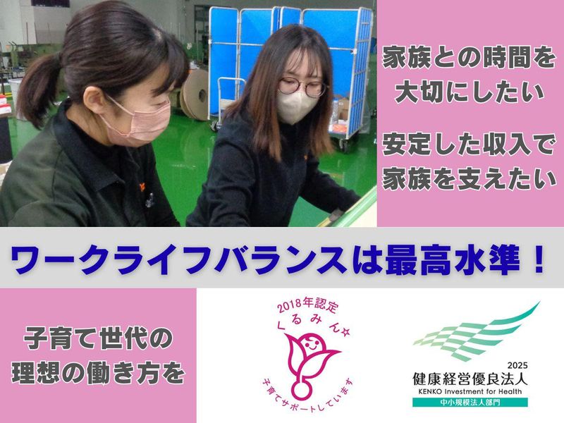 求めている人材 ◇高卒以上(経験・資格は問いません) ◇第二新卒も歓迎!未経験スタート活躍中! ◇未業種からの転職で、キャリアアップ している社員もたくさんいます! 《こんな方にピッタリ!》 ・仕事とプライベートを両立したい方 ・安定した環境で、長く腰を据えて働きたい方 ・家族や子どもとの時間を大切にしたい方 ・コツコツと作業するのが得意な方 ・細かい作業が好きな方 ・モノづくりに興味がある方 ・技術を身に付けたい方 当社では「長く働ける安心感」と 「努力をしっかり評価する仕組み」を両立しています。 OJTを通じて3ヶ月程度で独り立ちしていただき、 ゆくゆくは生産管理や部門のリーダーとしての キャリアアップも目指せる環境です◎ 家庭と両立しながら、着実にキャリアを 築いていきたい方をお待ちしています!