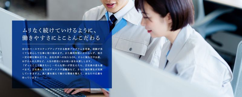 アピールポイント 当社が最も大切にしているのは、 「家族を優先すること」です。 お子様の学校行事や急な発熱など、 どうぞ遠慮なさらないで。 でも経理業務だからこその厳しさもあります。 プロとしての専門性と厳しさ、 それを支える役割分担とフレンドリーな人間関係。 「この会社、温かいな」 そう感じていただけるはずです。
