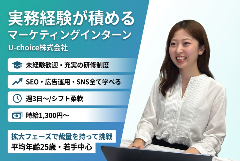 求める人材: ◆必須条件◆ ✅ 未経験可 ✅ 大学1〜3年生の方 ✅ 週3日以上、オフィス出社 ◆歓迎条件◆ ✅ 地味で細かい作業を継続できる人 ✅ 協調性がある人 ◆こんな方にピッタリ!◆ ✅ AIやデータなど、最先端のマーケティングを学びたい ✅ 一人のビジネスパーソンとして本気で成長したい ✅ 将来起業したい、事業を作りたいという野心を持っている ✅ 挑戦を楽しみ、学びながら改善を回せる方