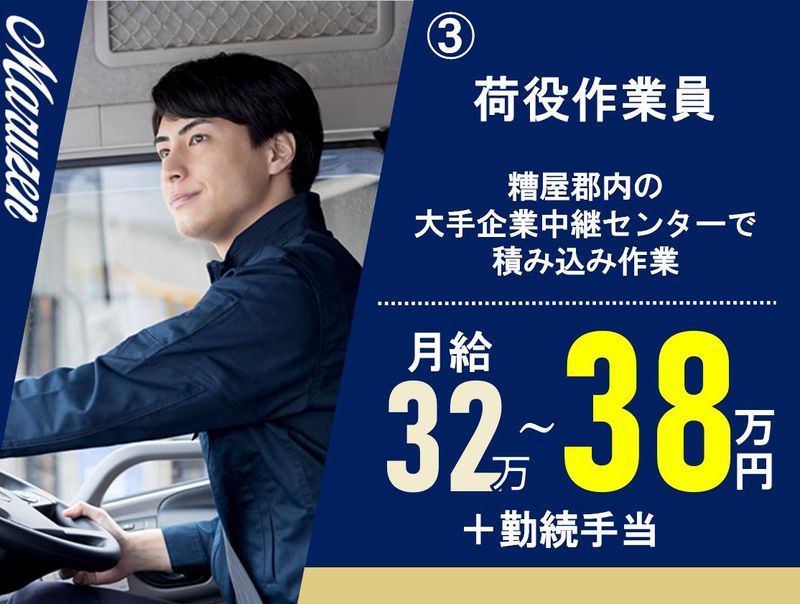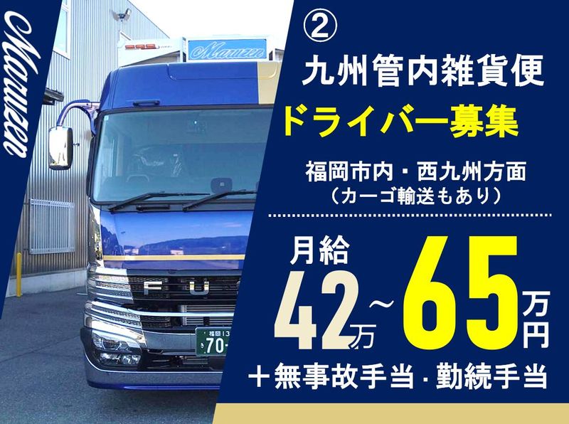 仕事内容 当社は、大手運送会社の中継センター⇔営業所間の店間輸送をメインに行っています。 お運びする荷物は多種多様で、 対応する車両も豊富に取り揃えています。 (中型車・大型車・トレーラー・中型・大型冷凍車あり) 【選べる働き方】 ・九州管内の輸送 ・長距離輸送 ・荷役作業員 ※希望に応じて職種を選択できます! 【未経験者も安心】 教育体制が充実しているので、初めての方も安心してスタートできます。 【働き方の特徴】 ・がっつり稼ぎたい方 →手積み作業あり(頑張り次第で高収入可能!) ※月収50万円以上のスタッフも多数在籍! ☆40代~50代がメインで女性ドライバーも活躍中! 【現場を見れば納得!まずはお気軽にお電話ください】 言葉で説明するより、実際に現場を見ていただくのが一番わかりやすいと思います。 まずはお気軽にお問い合わせください! = = = = = = = = = = 【選べる仕事内容】 ①長距離冷凍輸送 熊本~関西方面(帰りはドライ雑貨輸送になります) ②九州管内雑貨便(カーゴ輸送あり) 大手企業の中継センターから九州各地の営業所への店間輸送。 福岡市内がメインで、南九州方面は 1泊2日コースもありますが、基本は毎日帰宅可能! 中型車運行もあり(西九州方面メイン)。 ③ 荷役作業員 糟屋郡内の大手企業中継センターで積み込み作業を担当。 免許がなくても働けます! ほとんどが定期便の為、あなたにあった仕事を提案させて頂きますので安心してご応募ください!