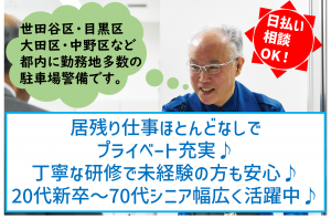 インフォメーション 終業時刻を迎えたら即帰宅。 ☆一緒に働くメンバー募集中☆ ◇◇◇◇◇◇◇◇◇◇◇◇◇◇◇◇◇◇◇◇◇◇◇◇◇◇◇◇◇◇◇◇◇◇◇◇◇◇◇◇◇◇ ☆東京都23区のスーパー・ホームセンター での警備スタッフ募集☆ 警備のお仕事は未経験・・・ という方でも安心! 当社に入社する方のほとんどは 未経験からのスタートです。 シフト制のため終業時刻が来たら同僚に挨拶をしてすぐ帰宅、という日がほとんどです。 毎日就業場所に直行直帰できるのでプライベートの時間もしっかりとれます。 50代・60代・70代のシニアの方も活躍中! 年齢制限はございませんので、定年後のお仕事やお小遣い稼ぎにもぜひ♪ 日払い・週払い制度もございますので、 お給料をすぐ受け取りたい・・・ という方もご相談ください! 安定した環境で一緒に働きましょう♪ ◇◇◇◇◇◇◇◇◇◇◇◇◇◇◇◇◇◇◇◇◇◇◇◇◇◇◇◇◇◇◇◇◇◇◇◇◇◇◇◇◇◇ ☆ご質問・ご応募はこちらまでお願いします! 東洋ワークセキュリティ株式会社 新宿営業所 TEL:03-6384-1836 もちろんWeb応募も歓迎です! ☆☆☆☆☆☆☆☆☆☆☆☆☆☆☆☆☆☆☆☆☆☆☆☆☆☆☆☆☆☆☆☆☆☆☆☆☆☆☆☆☆☆ 私たち東洋ワークセキュリティは、 全国に47拠点を展開し、 幅広いネットワークと培ってきたノウハウで、 皆様に「安全と安心」を提供しています。 警備のお仕事は「固そう・難しそう」といったようなイメージを持たれがちです。 しかし、実際は難しい動作や誘導はありませんし、重いものをもつ作業もありません! 簡単に覚えていただけるお仕事がほとんどで、 体に大きな負担がかかることもありません! そのため、社員の年齢層は幅広く、性別や経験も問わず活躍できます! 地域の安全と安心を守るために皆さんのお力をお貸しください! アピールポイント ☆★☆東洋ワークセキュリティの待遇☆★☆ 〇各種保険完備 社会保険にはすぐに加入していただけます。 扶養家族の方も加入していただけます。 ご相談ください! 〇時間通りに退勤! シフト制のため終業時刻を超えるような お仕事はほとんどありません。 また、お仕事の持ち帰りや緊急対応も ほとんどないため、 退勤後はゆっくりプライベートの時間を 過ごせます。 〇充実の研修制度で未経験でも安心 多くの人が警備経験なしの状態で スタートしています! 業務に就く前にしっかりと研修を受けられる ため不安をなくして働けます。 〇直行直帰可能 ご自宅と会社が遠い方もご安心ください。 就業場所までは直接向かっていただけます! もちろんたまに会社に顔を出していただく のも大歓迎です♪ 〇入社後の資格取得を応援! 警備のお仕事には資格もいっぱいあります! もちろん資格取得費用は全額会社負担、 合格のための講習会も開催します。 合格した方には資格手当を お支払いいたします! 〇充実の福利厚生 福利厚生倶楽部に加入できるので飲食店や 映画館などで様々な優待を受けられます。 年2回のミニボーナスや 備品・空調ウェア・防寒着・制服無償貸与も嬉しい特典♪ 〇この求人は東京エリア採用強化求人です! 当社では東京・神奈川・千葉エリアでの 募集を強化しております! ☆★☆東洋ワークグループについて☆★☆ 東洋ワークセキュリティは1976年に創業した従業員8,500名を超える東洋ワークグループ(TWG)の一員です。 TWGは、「Work(仕事)」を開発することで、多様な「人財」が活躍し「Work」に関わるすべての人々のやりがいと、物心両面の幸福「Well-being」を追求しているグループです。東北からグローバルに事業を展開する企業として、未来が求める多様な働き方やライフスタイルを推進し、また既存の事業にとらわれない“革新的”な“Business Developer”として働く人と共に成長し幸福を実現します。 【事業領域】 ■HRセグメント 東北地方における人材ビジネス業界のパイオニアとして、派遣、請負、人材紹介、国際事業などを通じて、人と組織にかかわる多様なサービスを提供しています。インドネシア法人によるアジア圏の人材採用も展開しています。 ■SEC(Security)セグメント 東北最大級のマンパワーを強みとし、警備を主体とする総合セキュリティ事業、建物サービス事業、防犯・安全管理システム販売事業、保安用資器材レンタル事業の4分野を軸に展開しています。 ■SBE(Social Business Enterprise)セグメント SBEとは、障がい者や長期失業者など、 特に雇用を得にくい人たちを優先的に雇う企業の意味です。東洋ワーク株式会社の洗浄事業として始まり、2010年に東洋ワークグループの特例子会社として事業独立。洗浄事業を通して、障がい者に安心して働ける機会を提供し、自立を支援しています。 ■Abroad(海外展開) 人材確保から海外進出支援まで、アジア圏でのビジネスをプロデュースしています。法人設立以来、アジア圏で人材開発や市場参入支援に取り組んできました。時代に先駆けてアジアに目を向けたのは、日本の少子高齢化による労働人