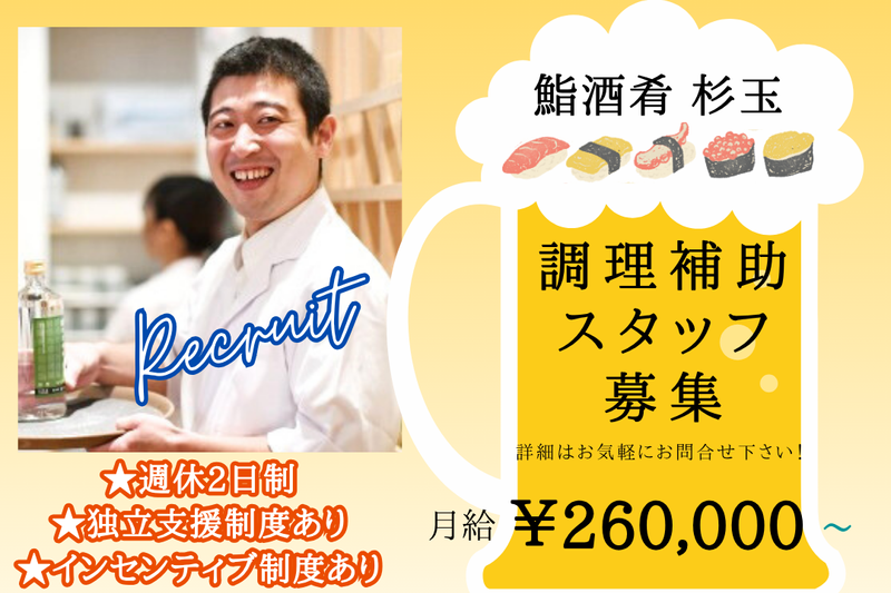 仕事内容 *〜*〜*〜*〜*〜*〜*〜* 月給26万円~דリーダーを育てる会社” レイリーフードテックが運営する 『鮨酒肴 杉玉』で 次のキャリアをつかむ、 “調理補助スタッフ”募集! *〜*〜*〜*〜*〜*〜*〜* \レイリーフードテックで働くポイント/ ★ 全員インセンティブ制度 → チームで成果をわかちあう文化 ★ “役職ではなく役割”を重視する、 人が育つ組織 ★ キャリアステップ明確 → 一般→店長→SV→部長→独立も ★ 飲食×マーケ支援の多角経営 → 成長性と安定性の両立 ★ 独立支援制度あり (店長経験3年~、資金含め伴走) ··—··—··—··—··—·· 【仕事内容】 まずは調理場でのサポート業務からスタート! 「料理を正しく・丁寧に仕上げること」から 一緒に進めていきます。 ◆ 食材の下処理・下ごしらえ ◆ 焼く/揚げる/盛り付けなど、簡単な工程の担当 ◆ 洗い場対応・キッチン内の整理整頓 など 慣れてきたら、 「仕込みの段取りが組める → メインの工程を任せられる → 後輩に教えられる」 と、キッチン内での役割が広がっていきます。 ··—··—··—··—··—·· 【レイリーフードテックってこんな会社!】 代表の飯田・村上は、 元々同じ飲食企業で働いていた仲間。 「自分たちの力で、お店や人の未来を つくれる会社をつくりたい」 その想いから、2022年に レイリーフードテックを創業しました。 掲げたミッションは “ライズリーダー(リーダーを輩出する)”。 ★ 役職ではなく「役割」で評価する ★ 人が育てば、会社は強くなる ★ 「入ってよかった」と胸を張れる職場にする この価値観を軸に、 評価・研修・キャリア制度のすべてが “人を育てるため”に設計されています。 現在は、水戸・つくば・いわきにて 6店舗を展開。2036年に100店舗、 上場を目指し、拡大中です。 さらに、飲食だけでなくSNS運用支援、 マーケティング支援なども行い、 地方企業が「勝てる仕組み」を つくる力にもなっています。 ··—··—··—··—··—·· 【展開ブランド】 ・串かつのぶた。(自社業態) ・0秒レモンサワーときわ亭(FC) ・鮨酒肴 杉玉(FC) 【『鮨酒肴 杉玉』について】 大手回転寿司チェーン「スシロー」が 手がける話題の寿司居酒屋ブランド。 “おいしいお寿司と酒肴を、 気軽に楽しめる価格で” をコンセプトに、 ユニークなメニュー名と本格的な味が 人気のお店です。 鮮魚の仕込み・揚げ物・焼き物など、 和食を中心に多彩なメニューを提供。 また、効率的な導線設計や タッチパネル注文により、 スタッフの負担を減らしながら スムーズなオペレーションを実現。 キッチンとホールが連携し、 チームでお客様を楽しませる空間です。 ··—··—··—··—··—·· 【ここが魅力!】 ◆ 評価は“リアルタイム推薦制” ◆ インセンティブは全員対象 ◆ 育成に強い会社 ◆ キャリアステップが明確で速い ◆ 実績 (副店長→2ヶ月で店長代行、店長→約1年でSV など) ◆ 独立支援制度あり ◆ 待遇面の安心感 (家族手当/まかない/資格支援/ネイル髪色自由 ほか) ··—··—··—··—··—·· 「仲間と店をつくる。自分の力で未来を切り開く。」 レイリーフードテックは、拡大期のど真ん中。 新しい役割もポジションも次々に生まれるため、 “役職の空き待ち”とは無縁です。 アルバイト→社員→店長→SV といったステップアップ事例も多数。 挑戦する仲間の背中が、 また次の挑戦を生んでいます。 その面白さを、ぜひ一緒に。 応募はお早めに◎